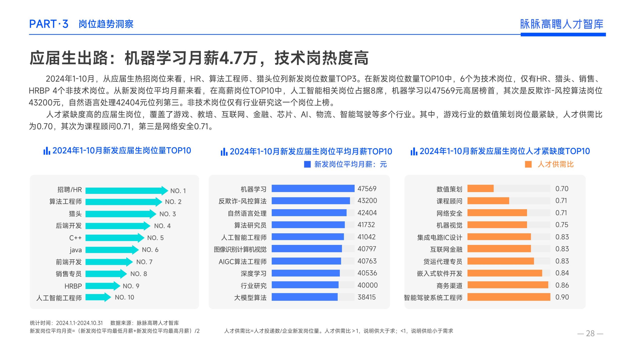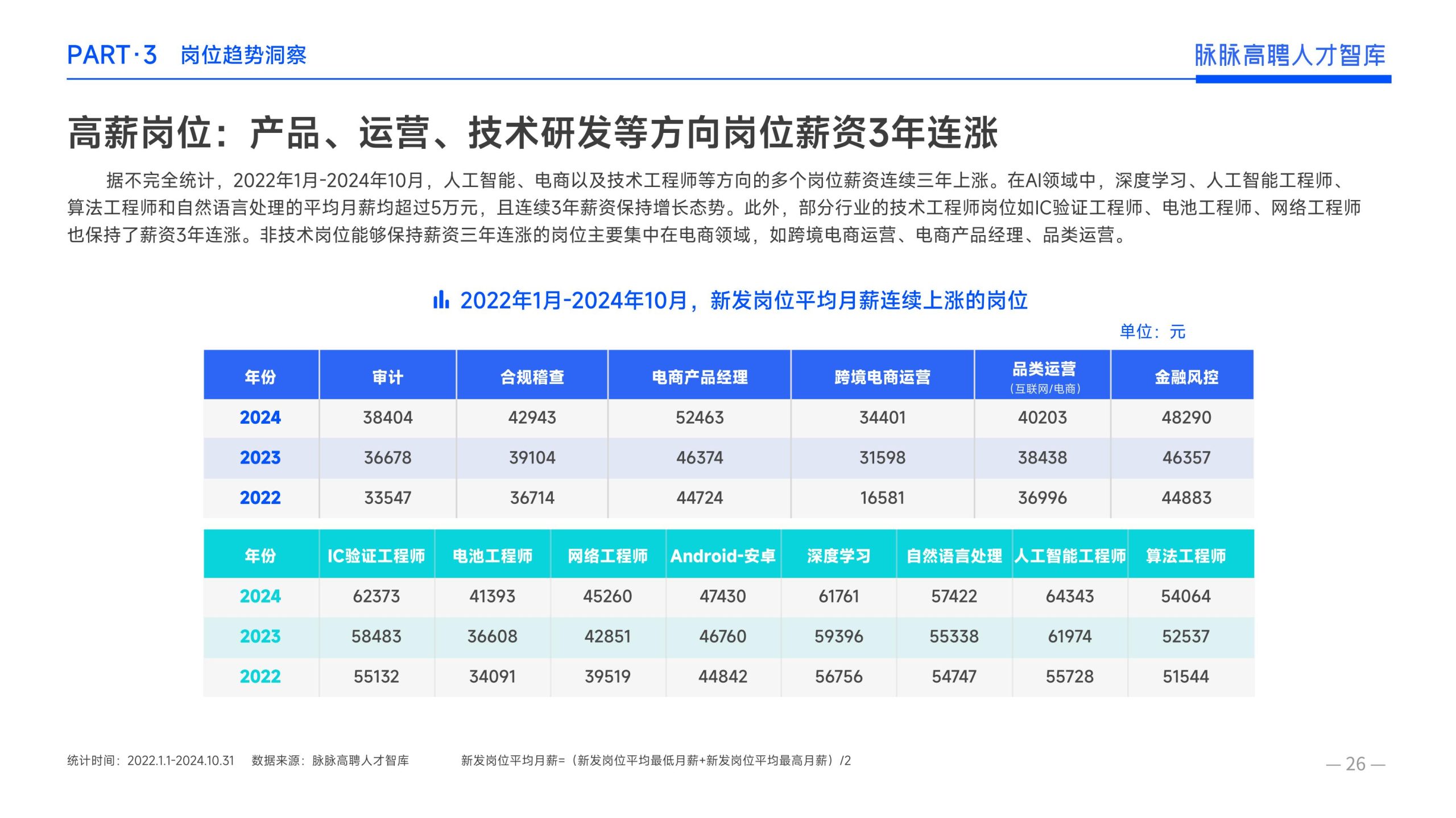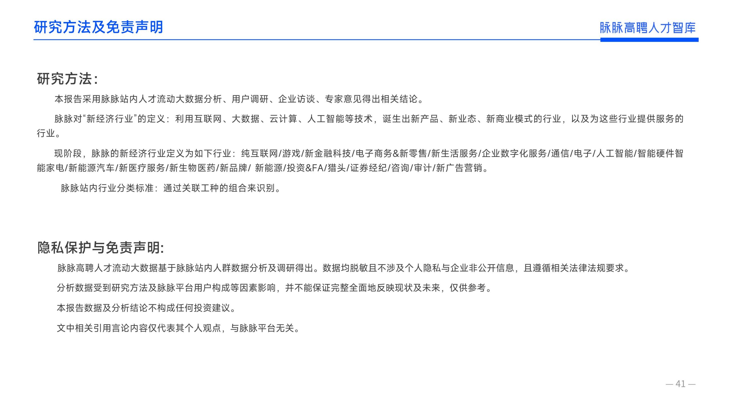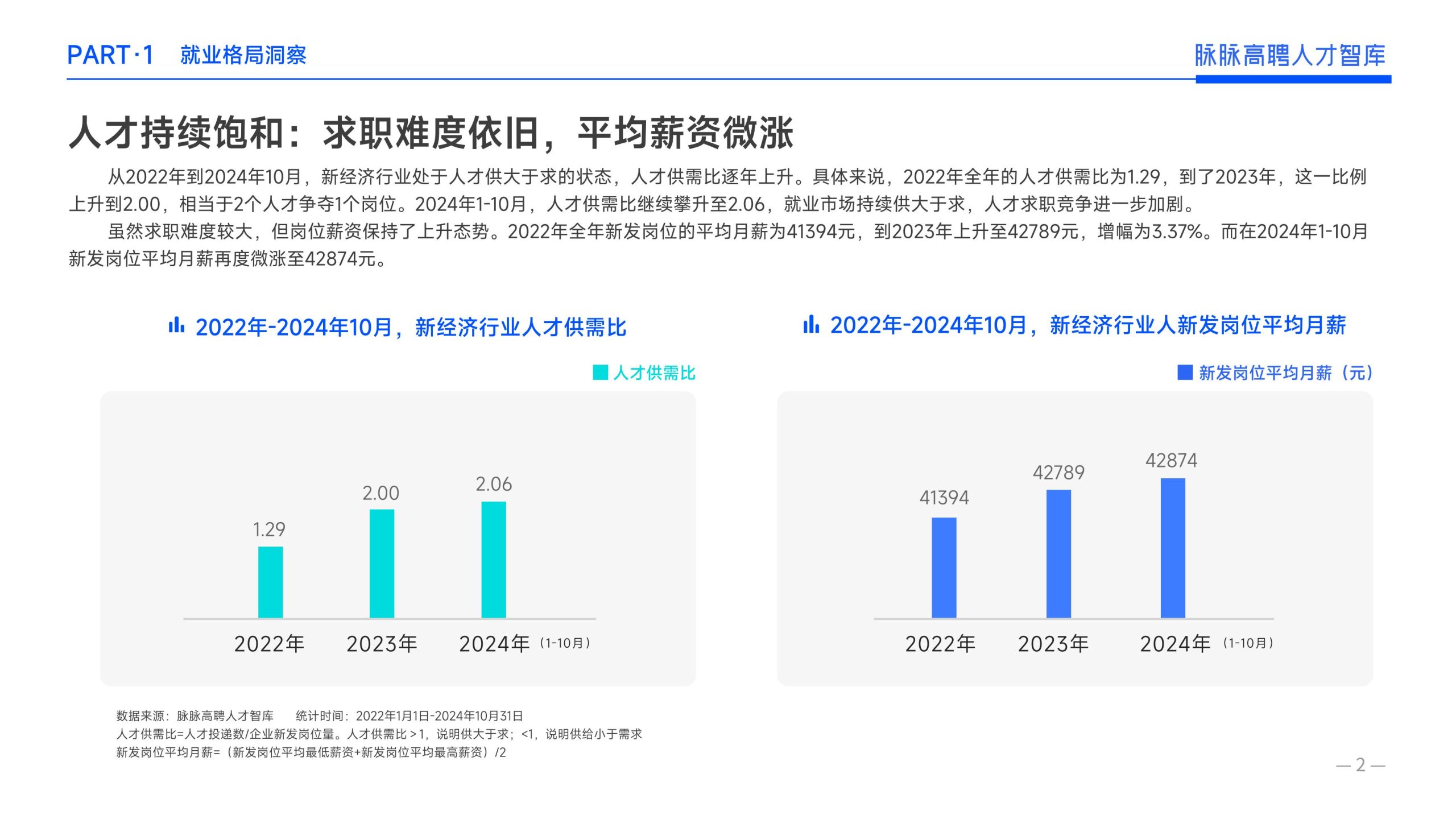 《报告》显示,2022年到2024年10⽉,新经济⾏业⼈才供需⽐逐年上升。2022年全年的⼈才供需⽐为1.29,2023年上升到2.00,相当于2个⼈才争夺1个岗位。2024年1-10⽉,⼈才供需⽐再度攀升⾄2.06,⼈才求职竞争进⼀步加剧。 虽然求职难度较⼤,但岗位薪资保持了上升态势。2022年全年新发岗位的平均⽉薪为41394元,2023年上升⾄42789元,2024年1-10⽉,平均⽉薪再度微涨至42874元。