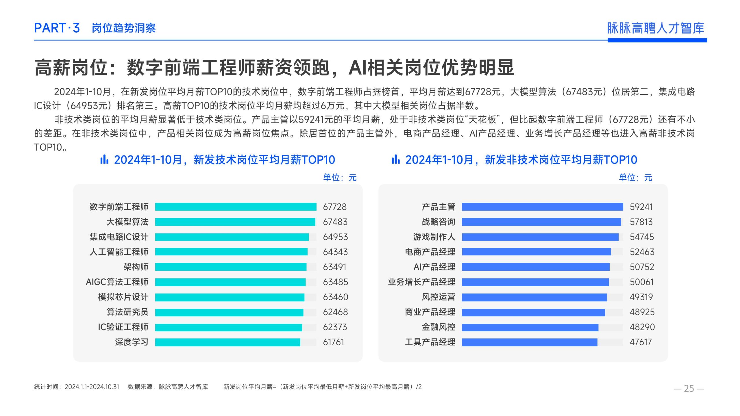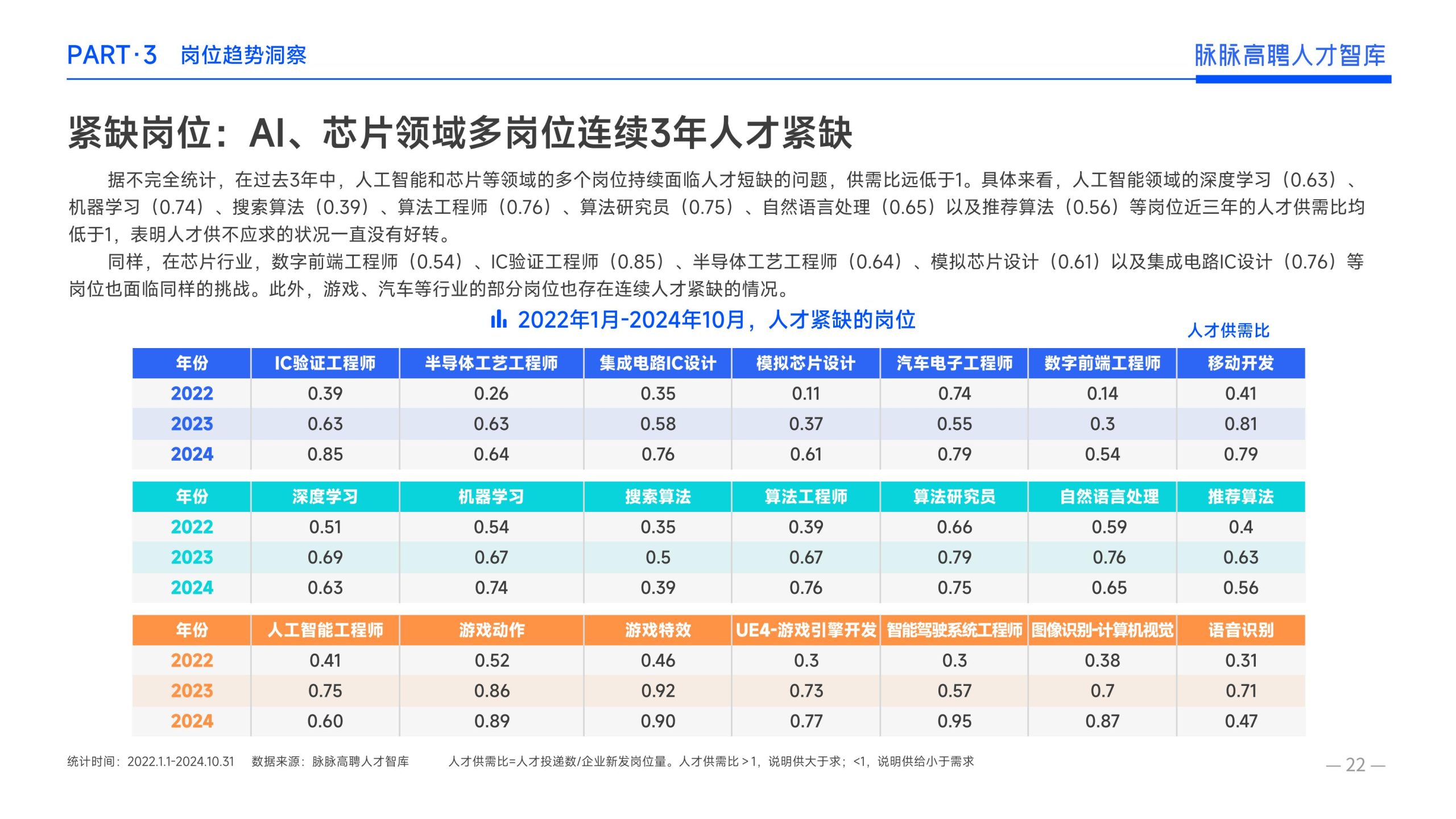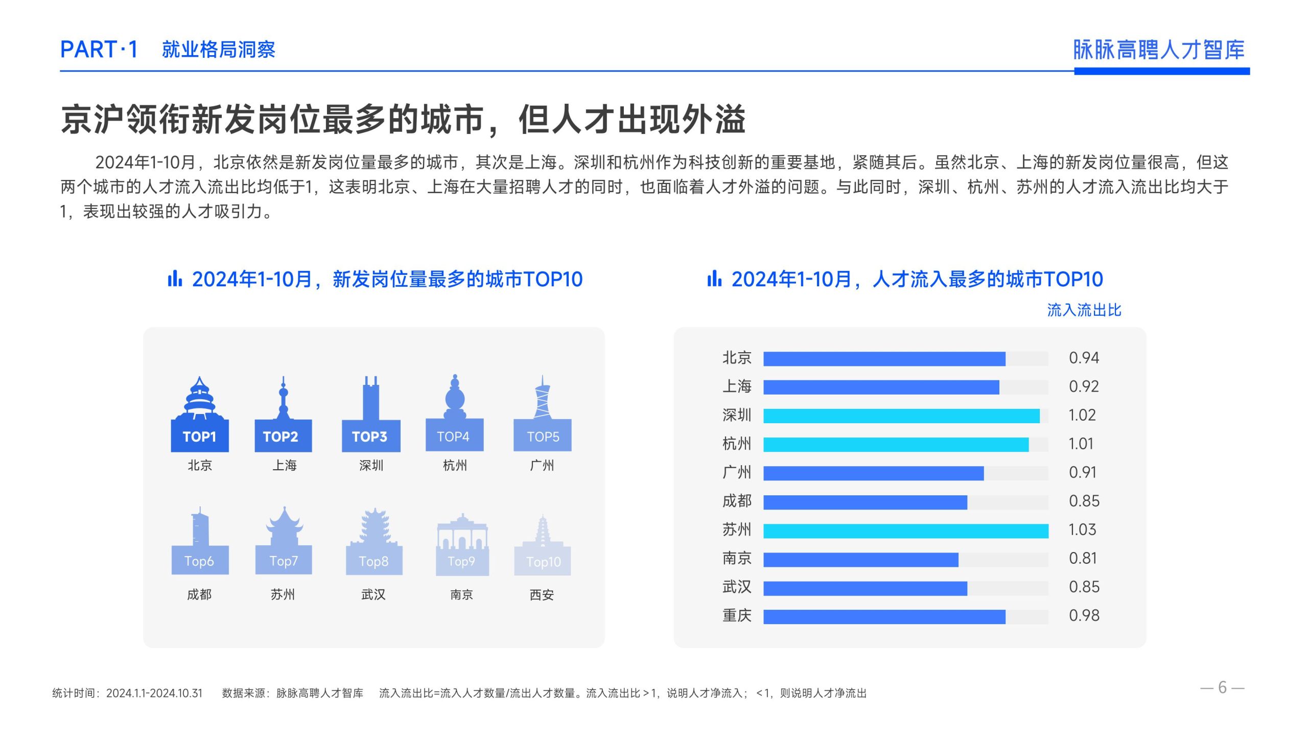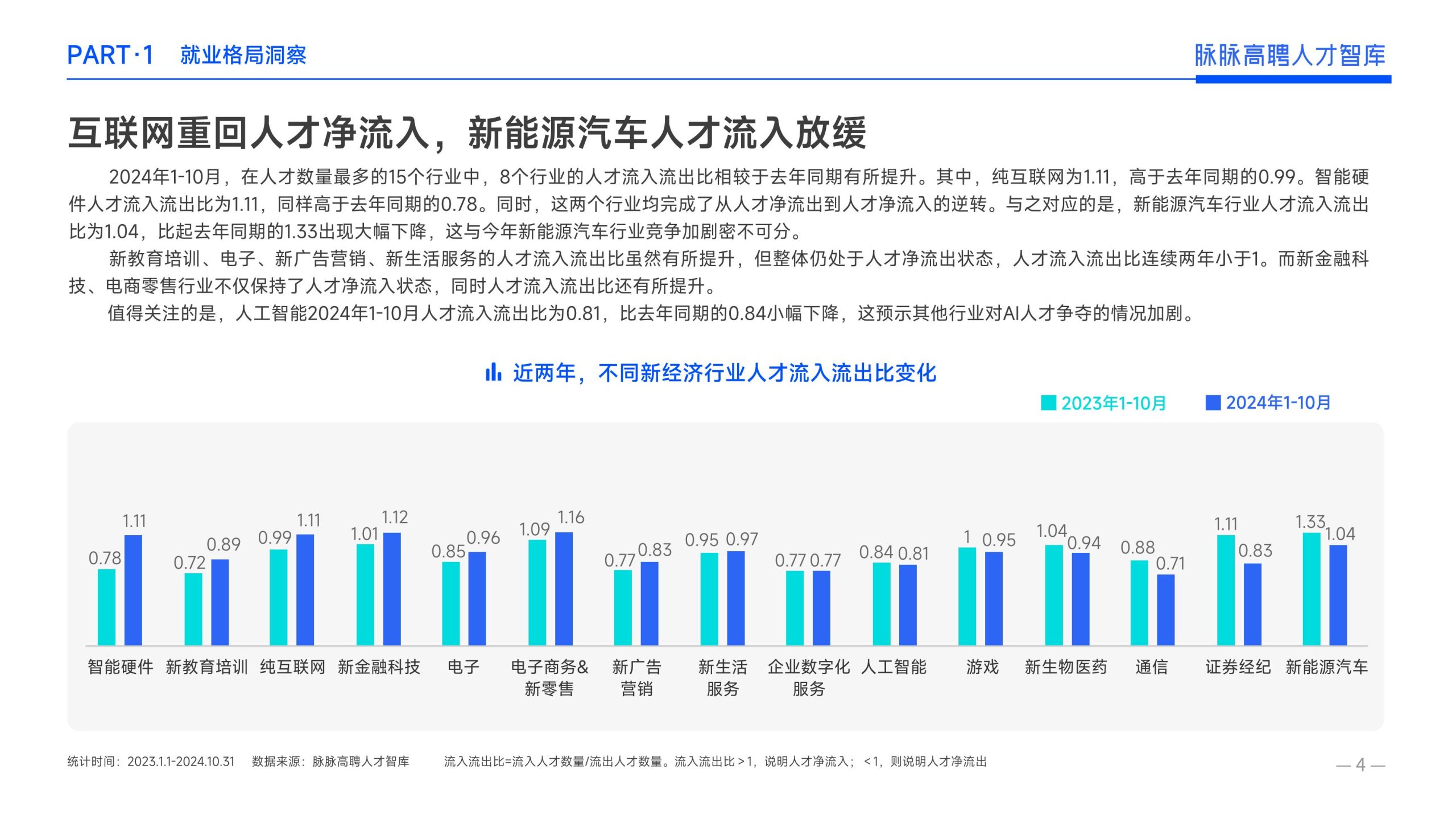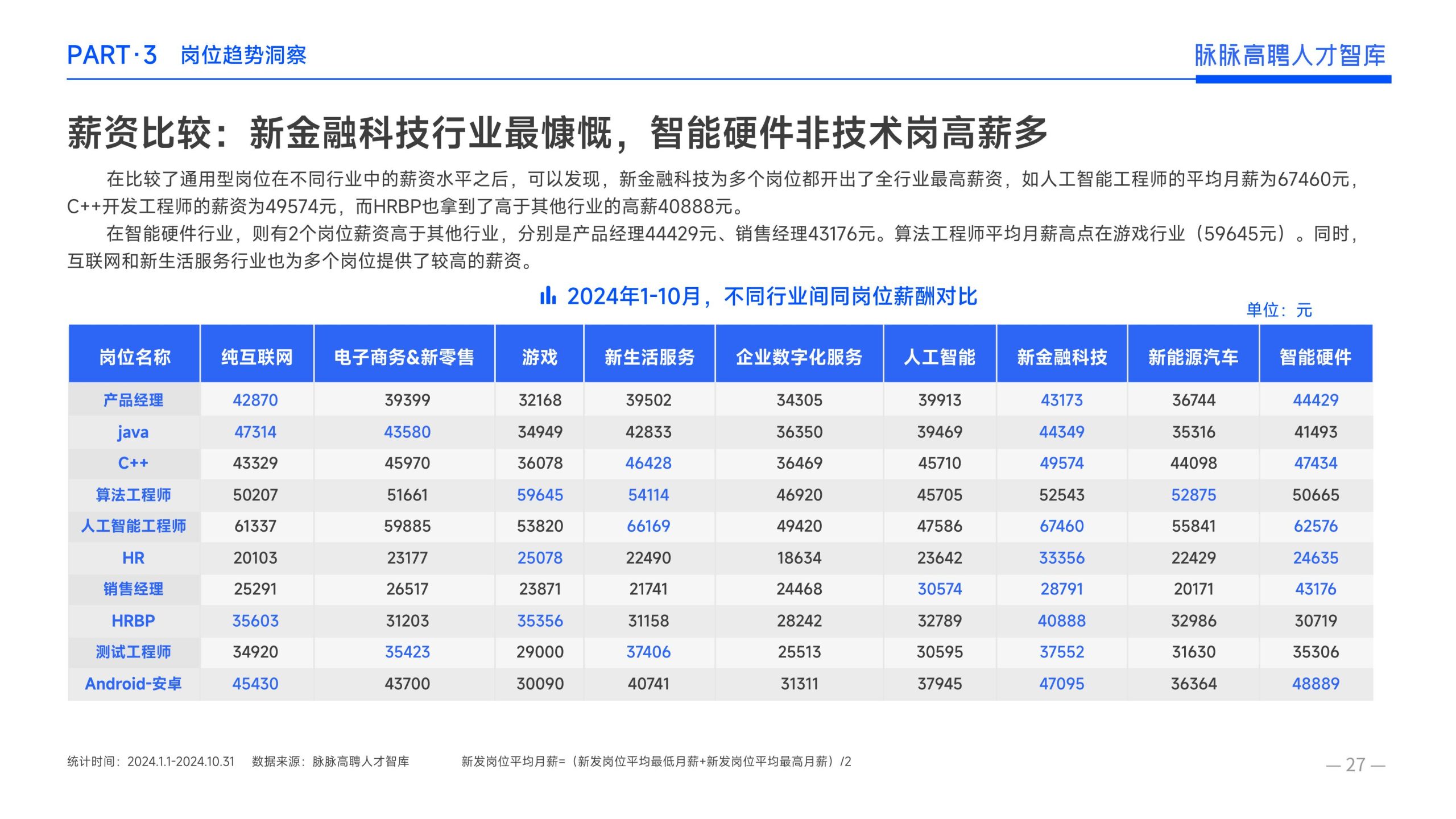 《报告》显示,2022年到2024年10⽉,新经济⾏业⼈才供需⽐逐年上升。2022年全年的⼈才供需⽐为1.29,2023年上升到2.00,相当于2个⼈才争夺1个岗位。2024年1-10⽉,⼈才供需⽐再度攀升⾄2.06,⼈才求职竞争进⼀步加剧。 虽然求职难度较⼤,但岗位薪资保持了上升态势。2022年全年新发岗位的平均⽉薪为41394元,2023年上升⾄42789元,2024年1-10⽉,平均⽉薪再度微涨至42874元。