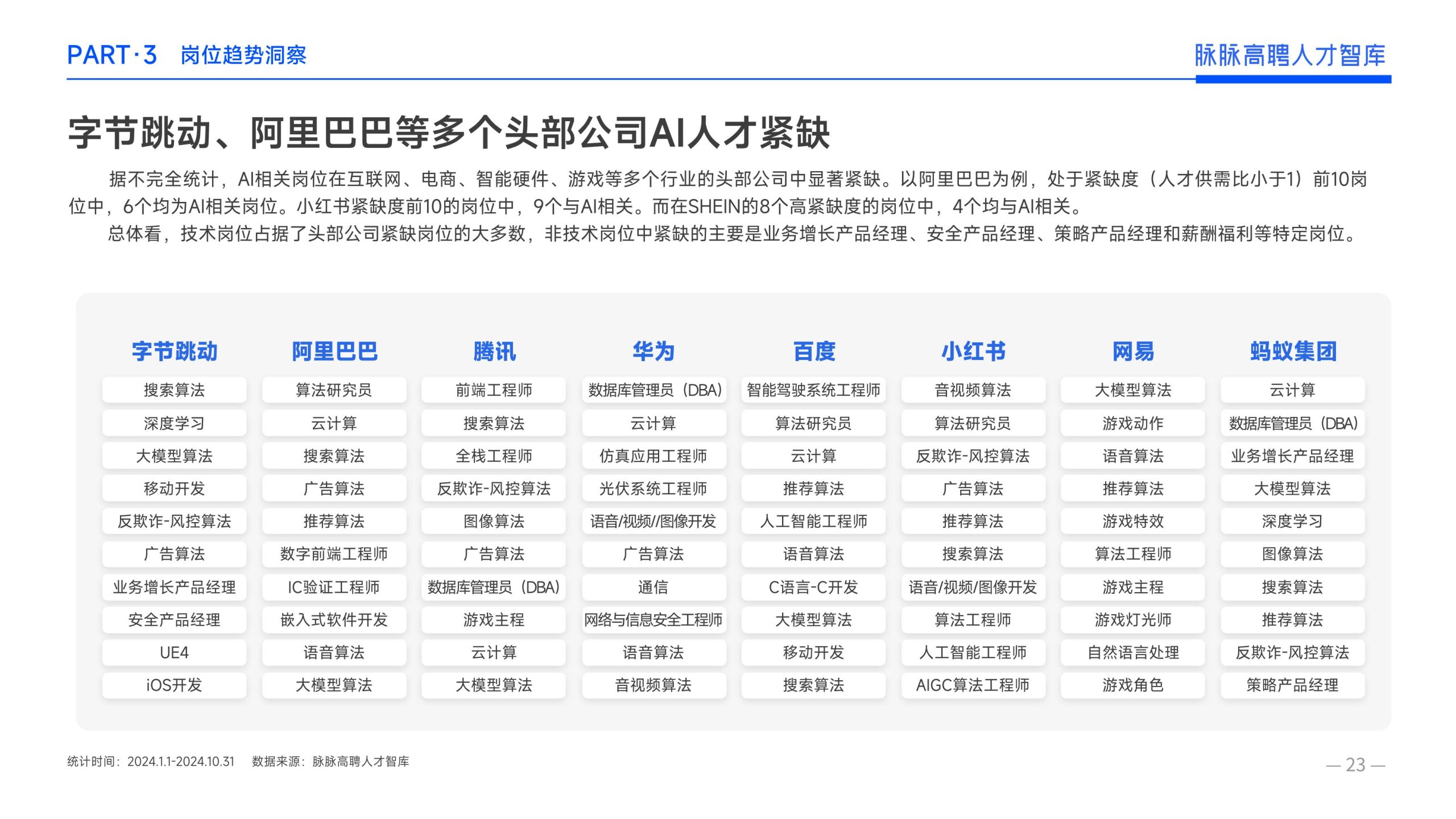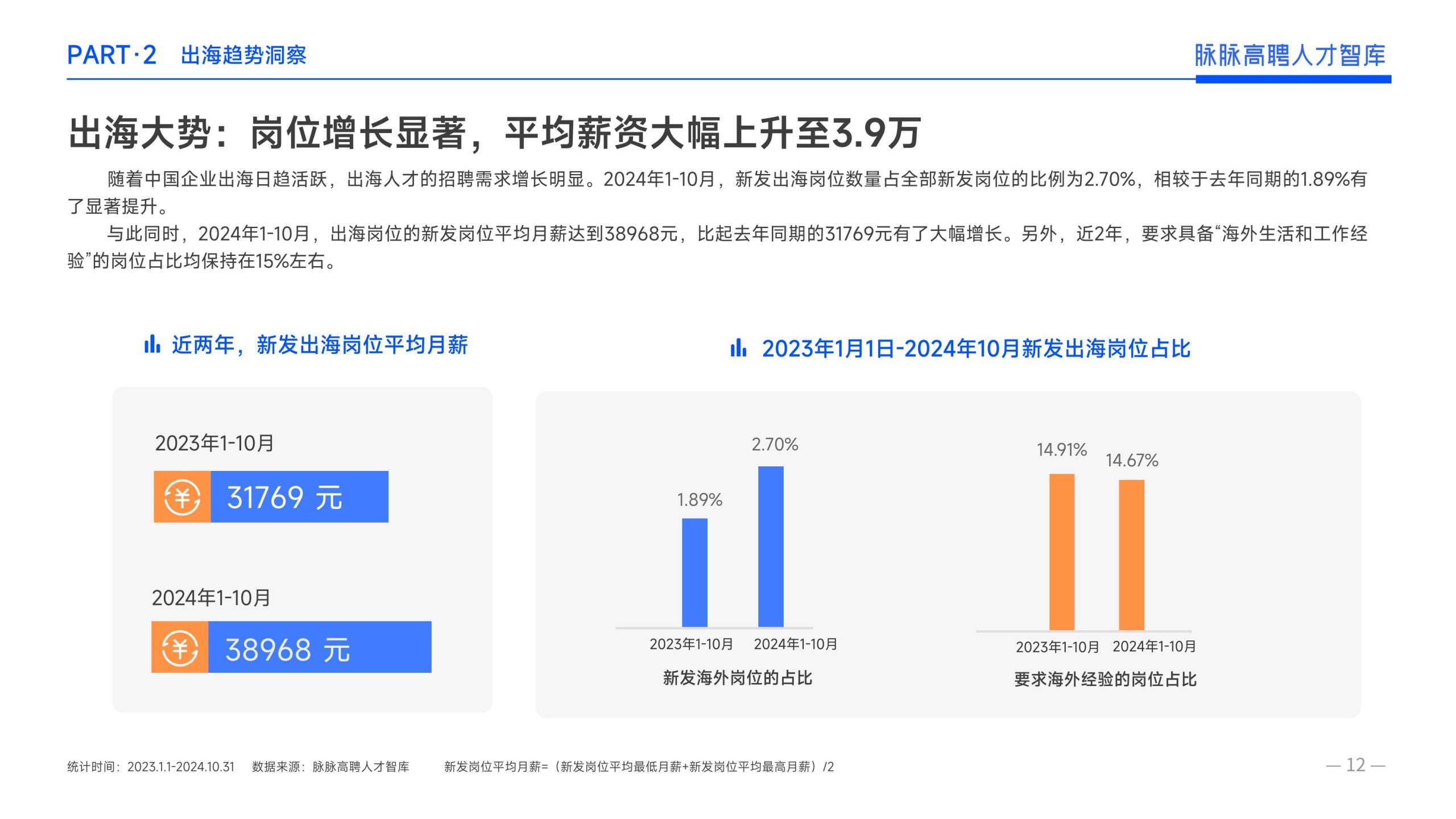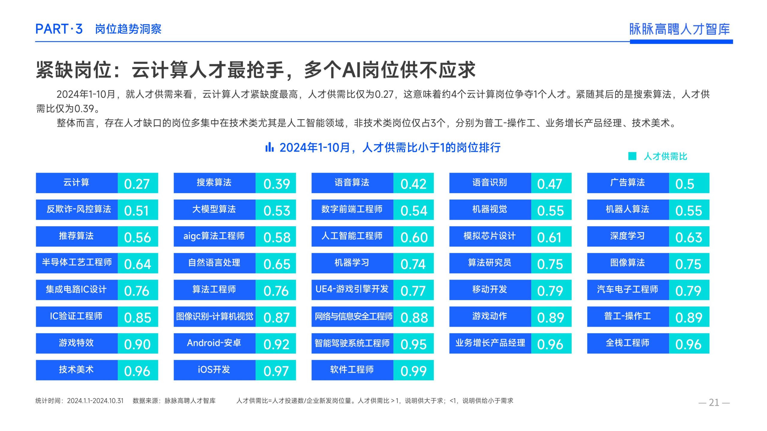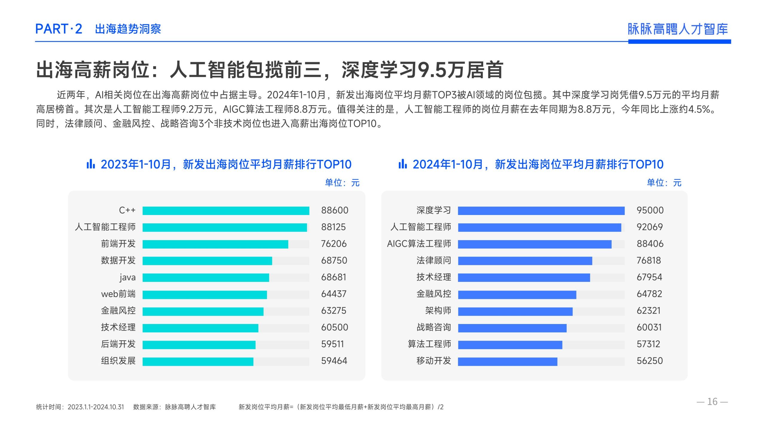 《报告》显示,2022年到2024年10⽉,新经济⾏业⼈才供需⽐逐年上升。2022年全年的⼈才供需⽐为1.29,2023年上升到2.00,相当于2个⼈才争夺1个岗位。2024年1-10⽉,⼈才供需⽐再度攀升⾄2.06,⼈才求职竞争进⼀步加剧。 虽然求职难度较⼤,但岗位薪资保持了上升态势。2022年全年新发岗位的平均⽉薪为41394元,2023年上升⾄42789元,2024年1-10⽉,平均⽉薪再度微涨至42874元。