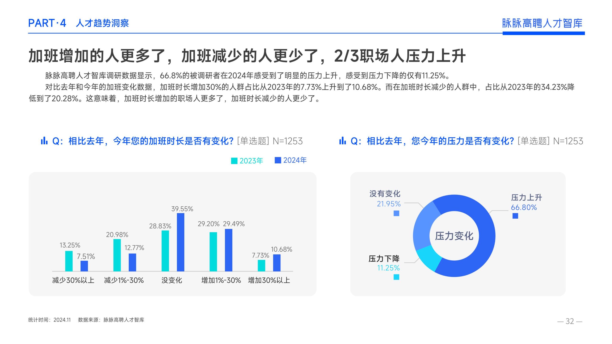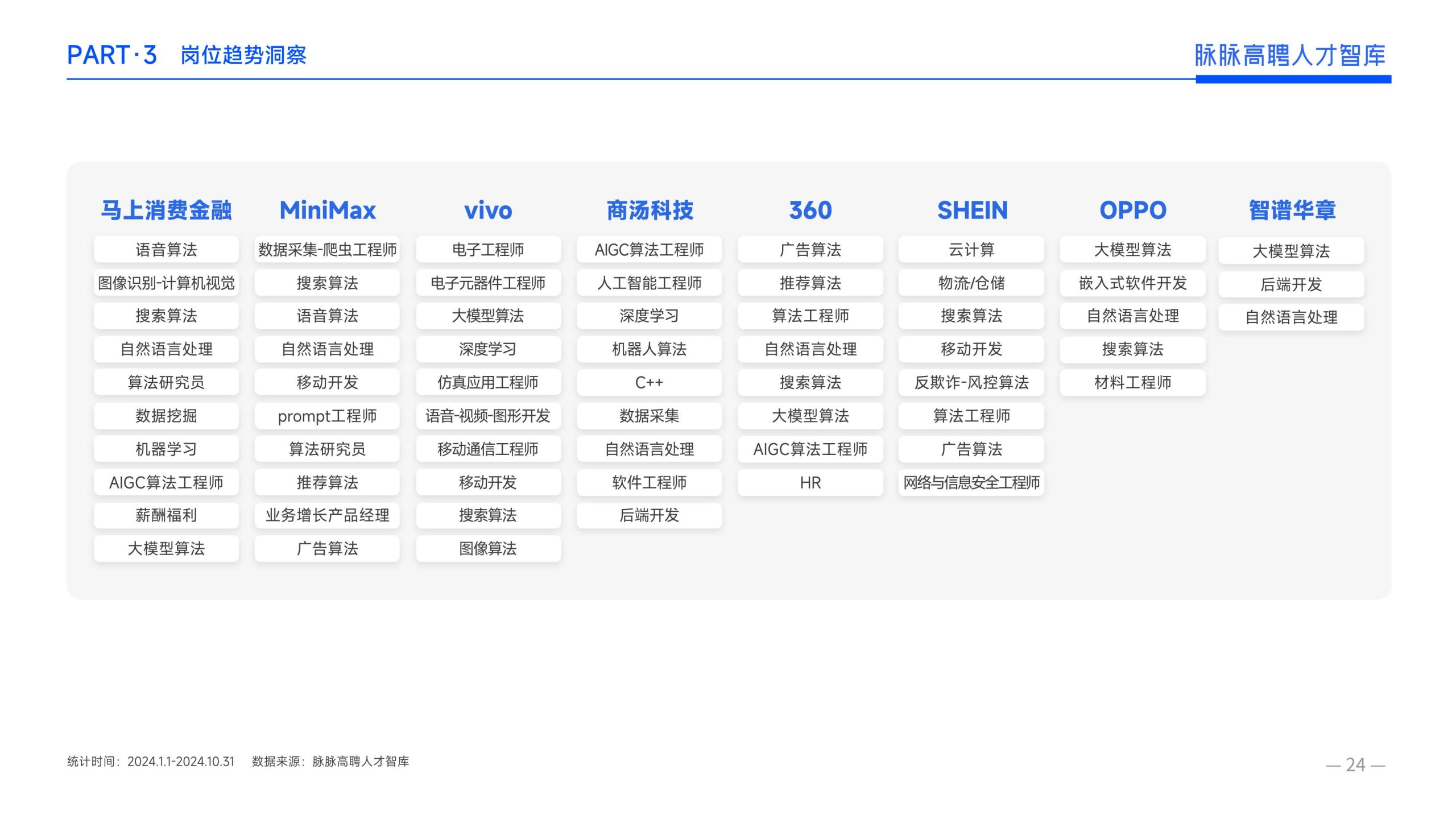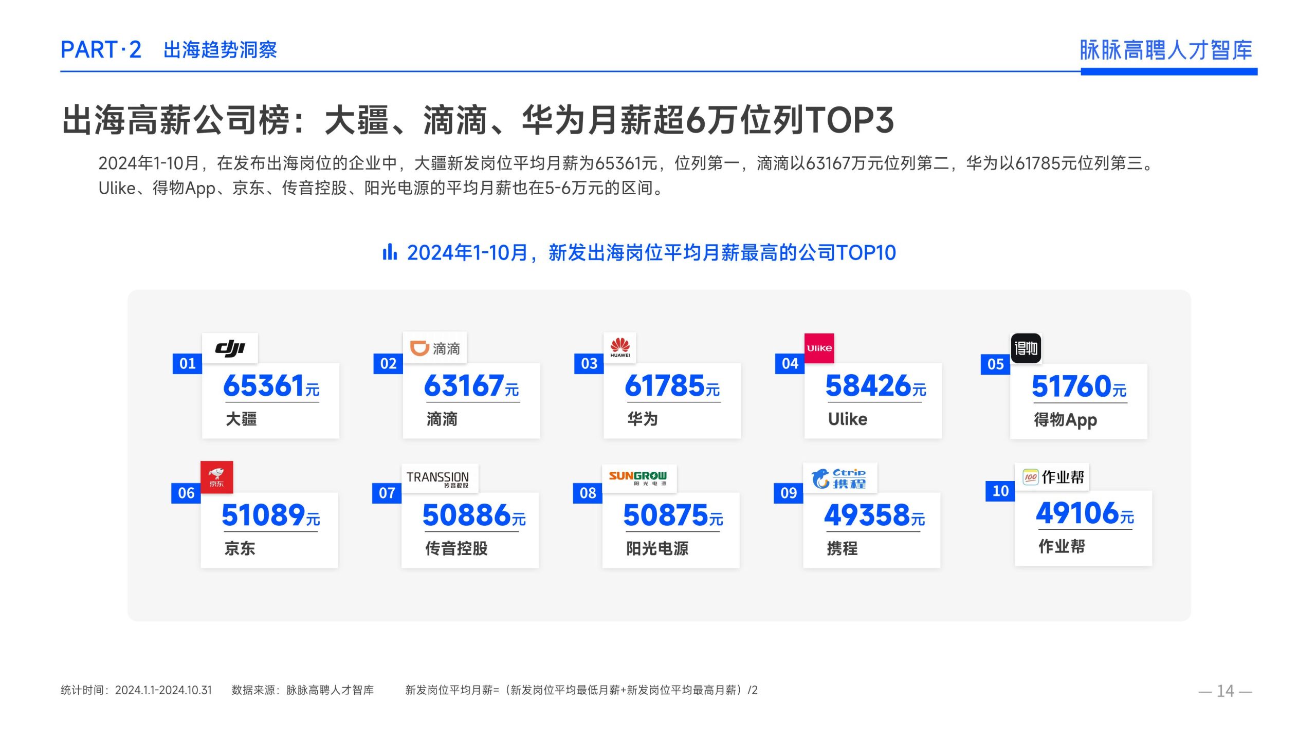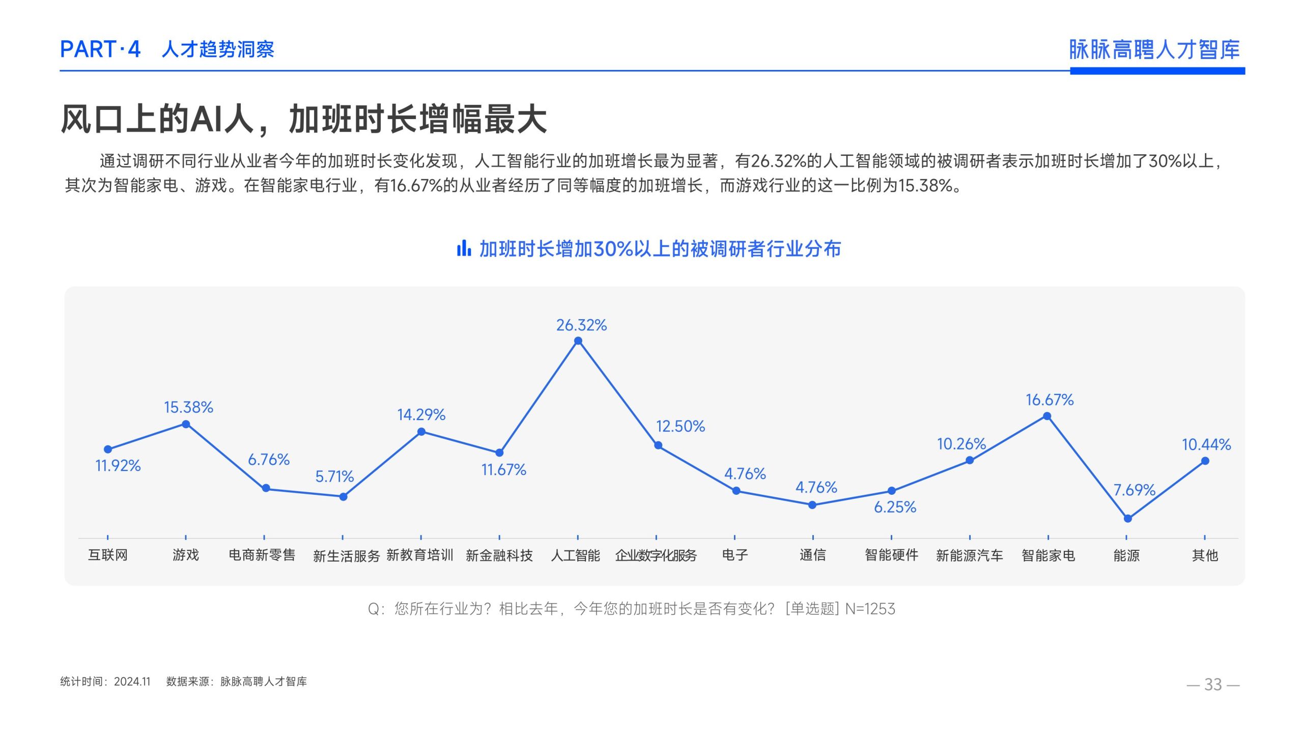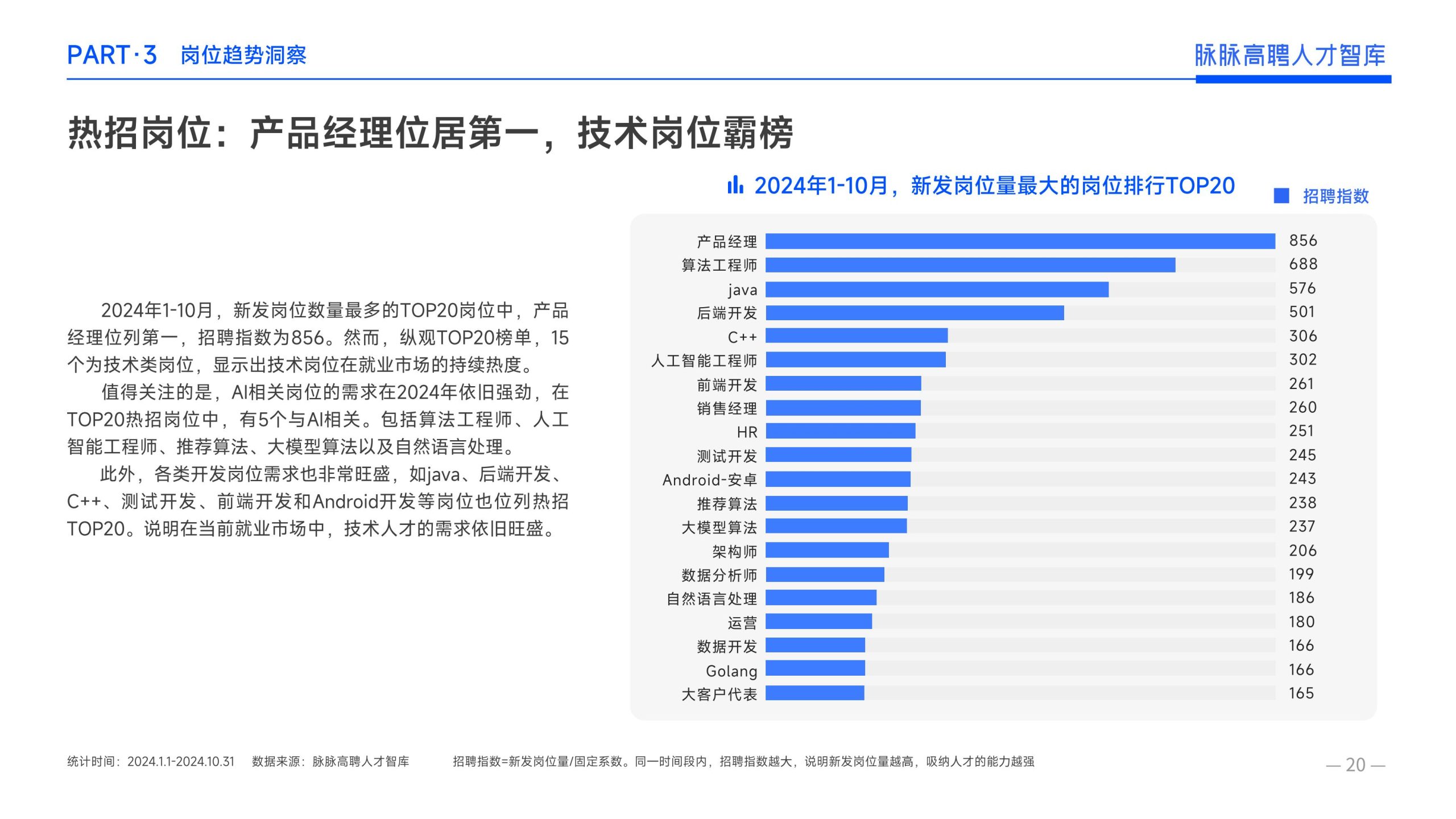 《报告》显示,2022年到2024年10⽉,新经济⾏业⼈才供需⽐逐年上升。2022年全年的⼈才供需⽐为1.29,2023年上升到2.00,相当于2个⼈才争夺1个岗位。2024年1-10⽉,⼈才供需⽐再度攀升⾄2.06,⼈才求职竞争进⼀步加剧。 虽然求职难度较⼤,但岗位薪资保持了上升态势。2022年全年新发岗位的平均⽉薪为41394元,2023年上升⾄42789元,2024年1-10⽉,平均⽉薪再度微涨至42874元。