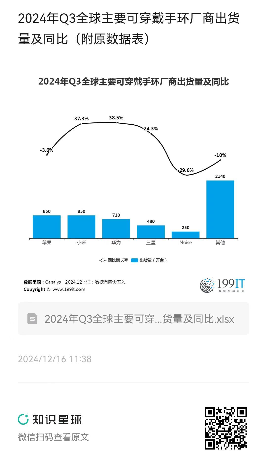 - 2024年Q2全球主要可穿戴手环厂商出货量及同比(附原数据表)