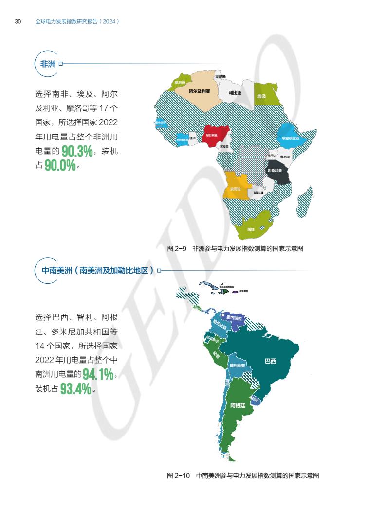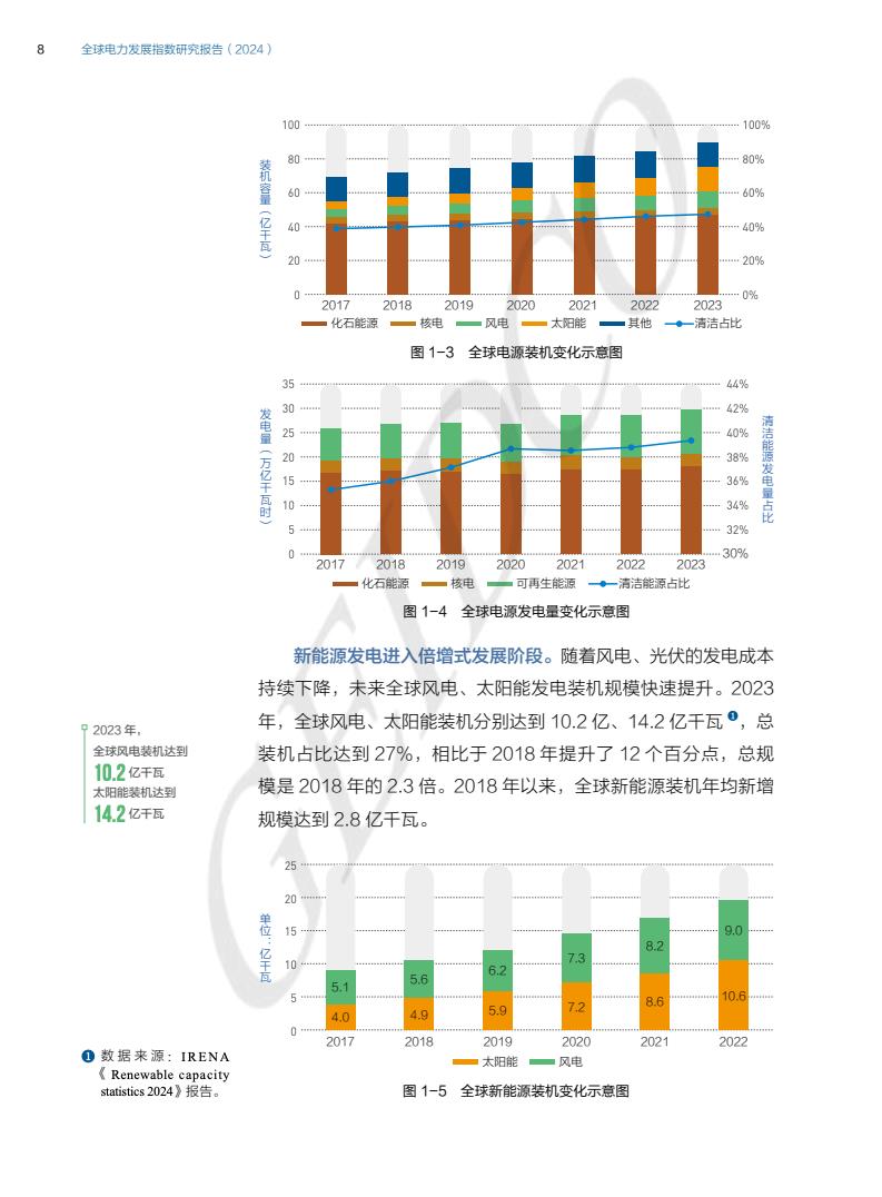 清洁能源发电装机和发电量占比逐步提升,电源结构持续优化。2023年,全球电源总装机达到 89.6亿千瓦,其中清洁能源装机约42亿千瓦,占比约47%,近5年增长7.6个百分点。2023年,全球电源总发电量达到29.7万亿千瓦时,其中清洁能源发电量占比达到 39.3%,近5年增长3.3个百分点。