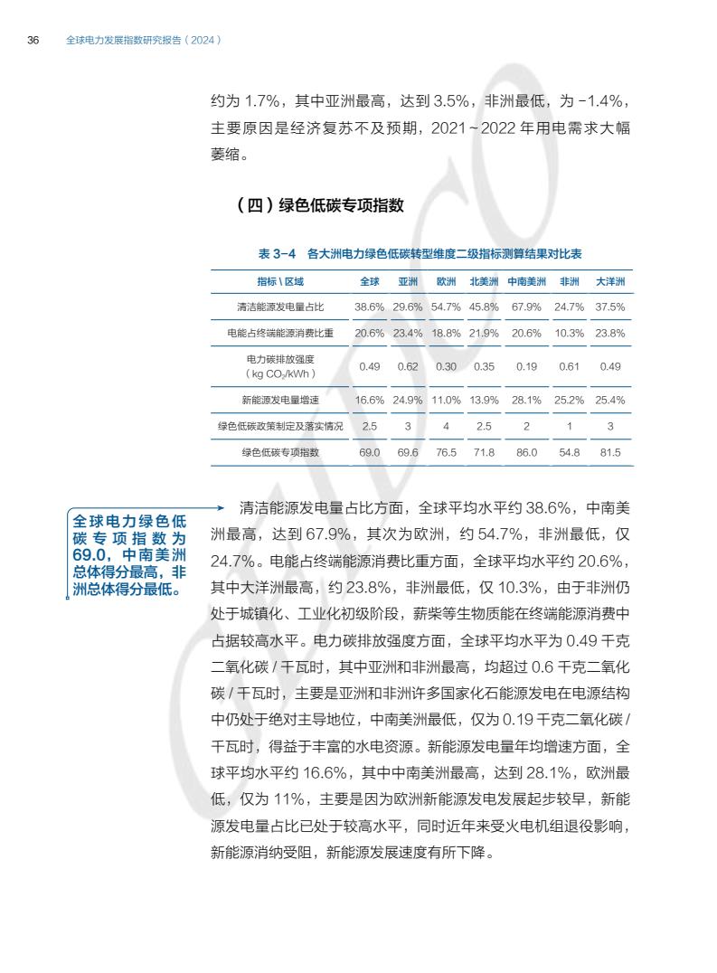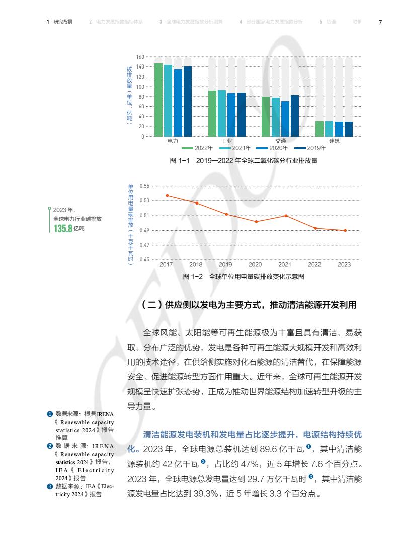 随着风电、太阳能发电量的快速增长,化石能源发电量占比逐渐下降,全球电力行业碳排放已进入结构性下降阶段。2023年,全球电力行业碳排放135.8亿千克,年均增长下降至0.9%。全球单位用电量碳排放持续下降,2023年降至约0.49千克/千瓦时,过去5年下降8个百分点。