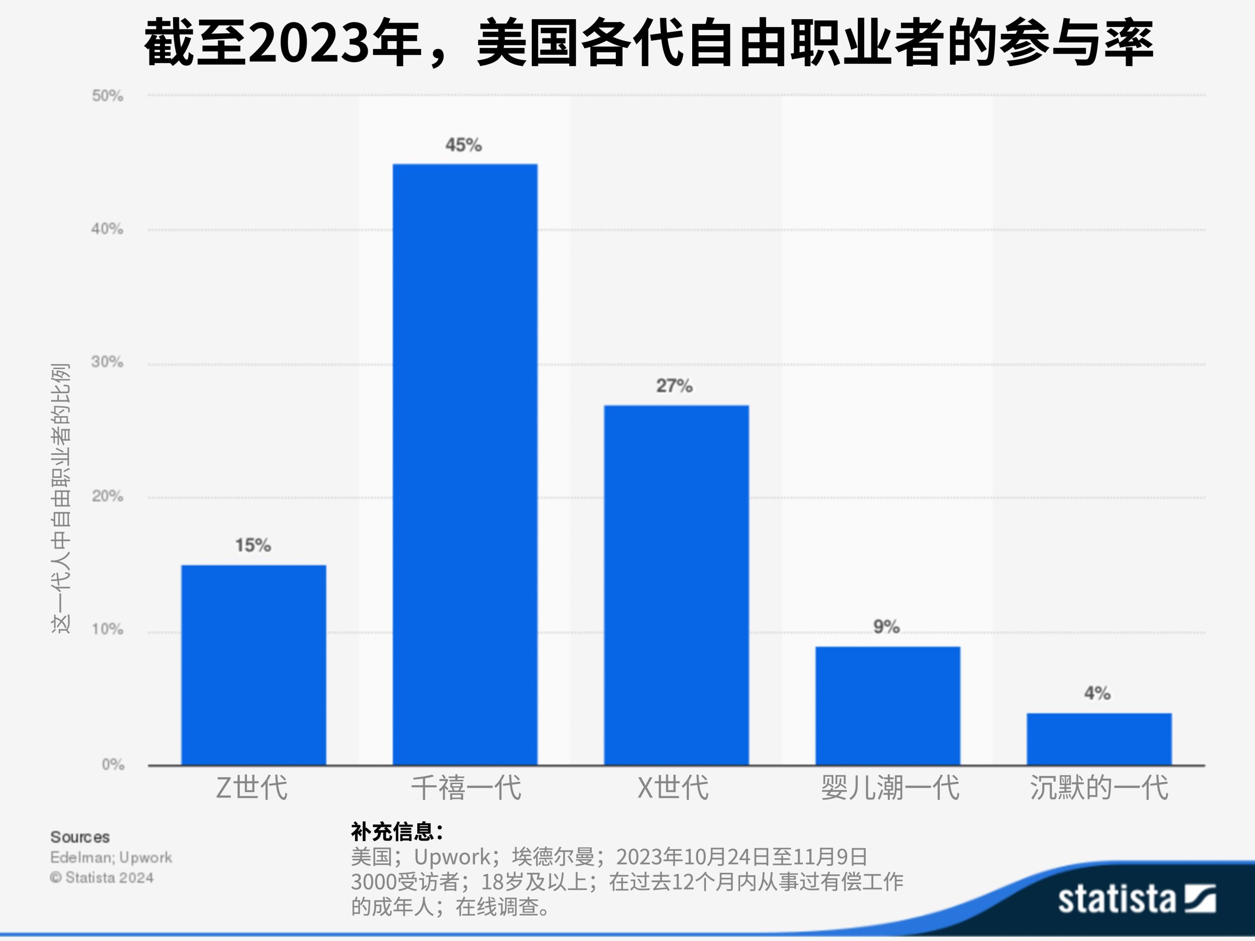 美国几乎一半的千禧一代工作者都是自由职业者。Image: Statista