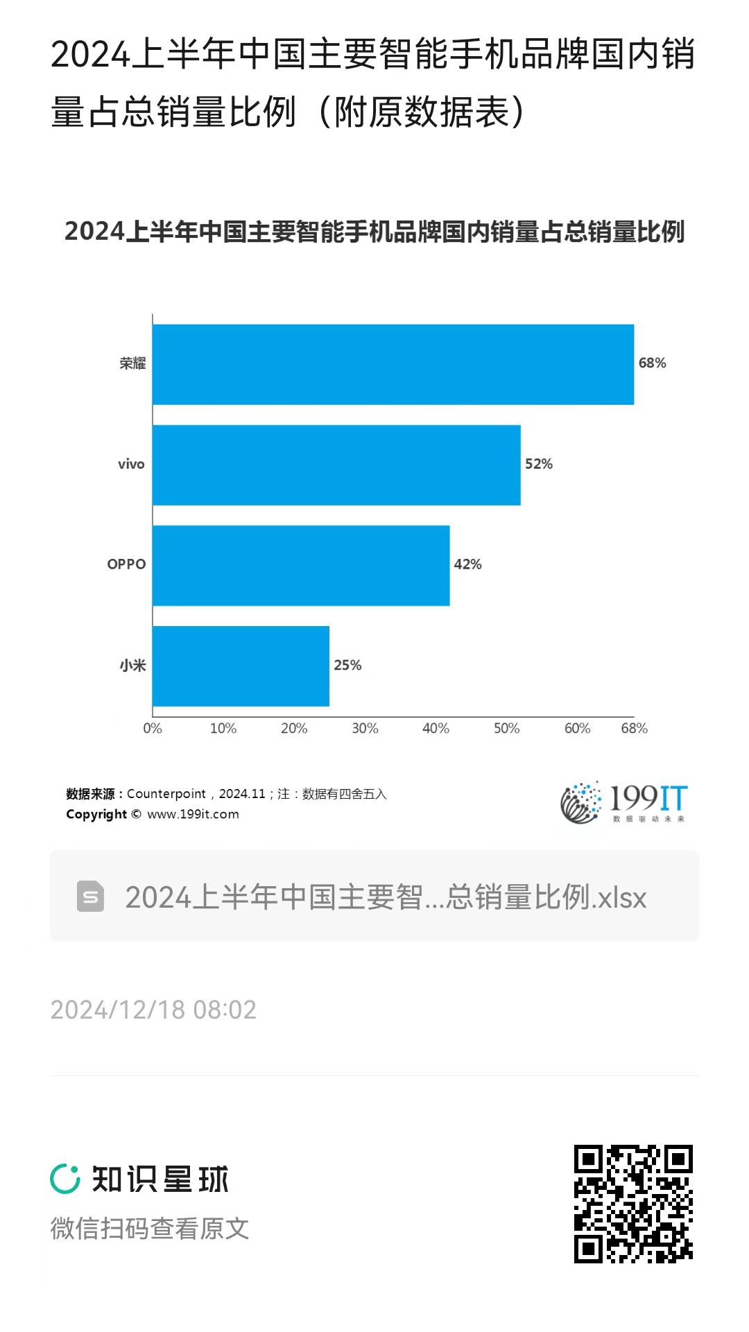 2024上半年中国主要智能手机品牌国内销量占总销量比例(附原数据表) ​​​