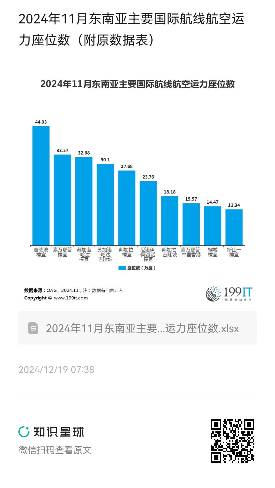2024年11月东南亚主要国际航线航空运力座位数(附原数据表) ​​​