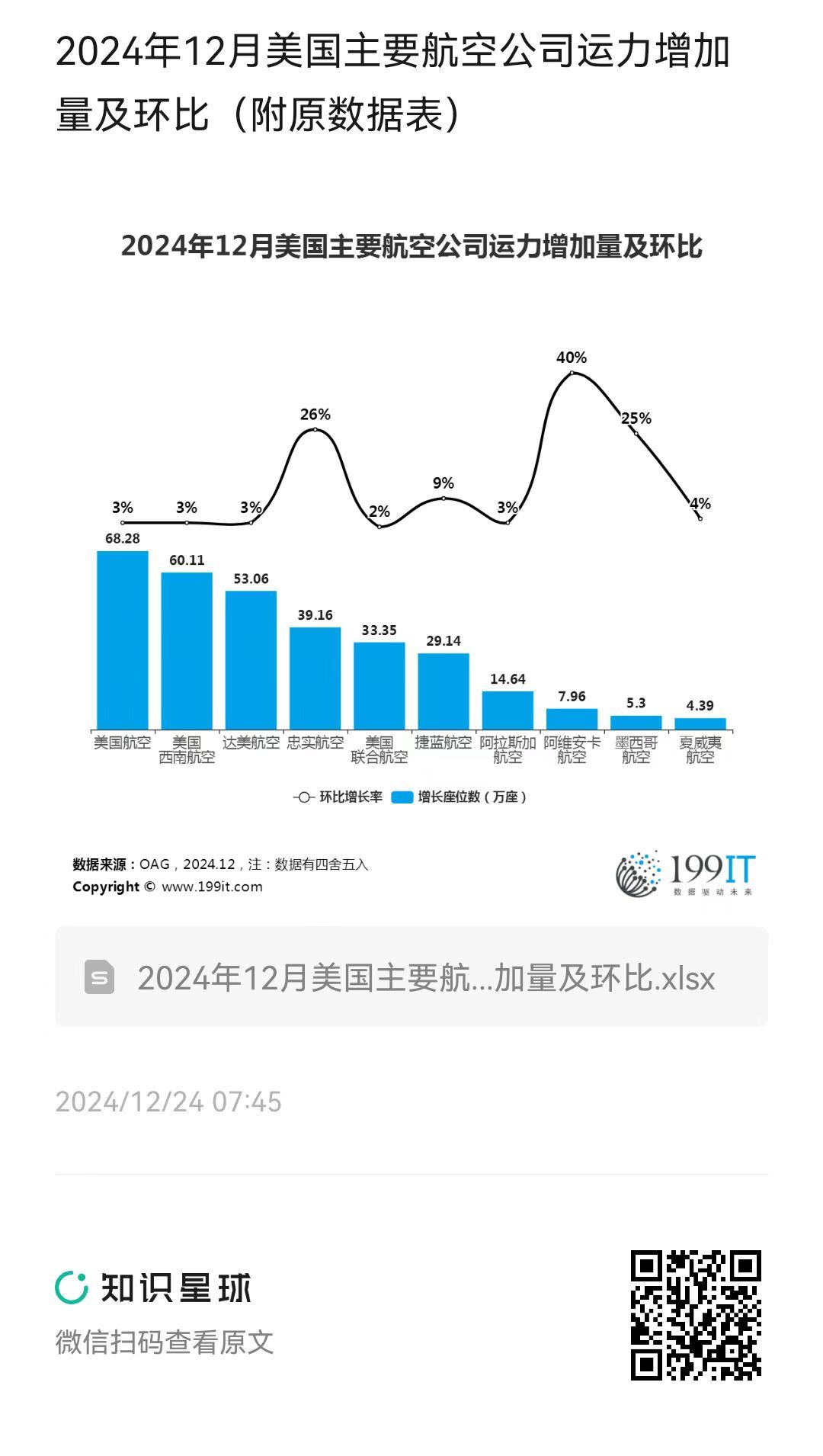 - 2024年10月美国主要航空公司运力增加量及环比(附原数据表)