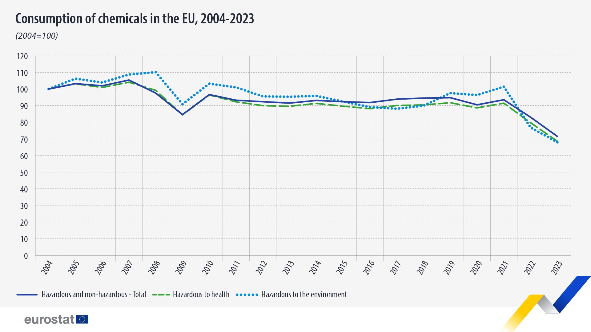 回顾过去,危险和非危险化学品的生产和消费在2004年至2007年期间都有所增加,之后在2008年和2009年金融危机期间有所下降。经过2010年的反弹,化学品生产和消费在2020年之前保持稳定,最近3年有所下降。
