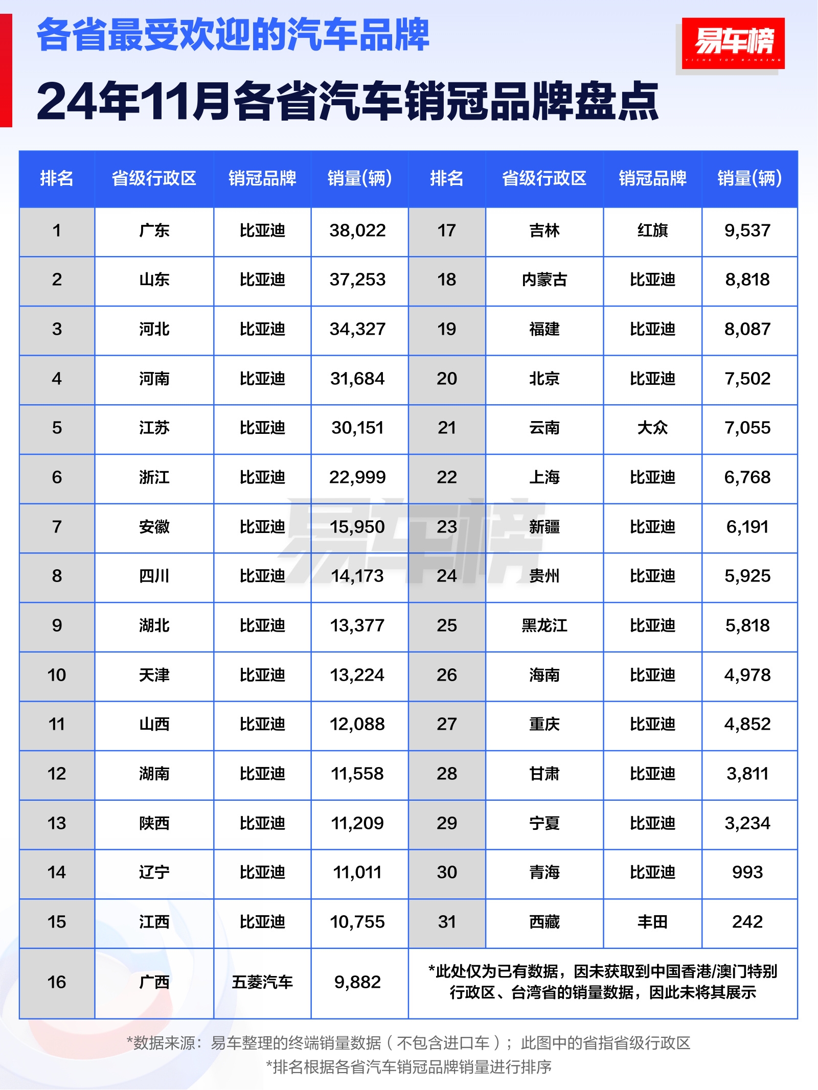 易车榜根据终端销量数据,发布了11月各省汽车销冠品牌盘点。因为未获取到数据,榜中暂未展示中国台湾省、香港、澳门的销冠品牌。具体来看,比亚迪作为中国车企销冠,在盘点图中几乎封神,成为国内27个省级行政区的销冠品牌。
