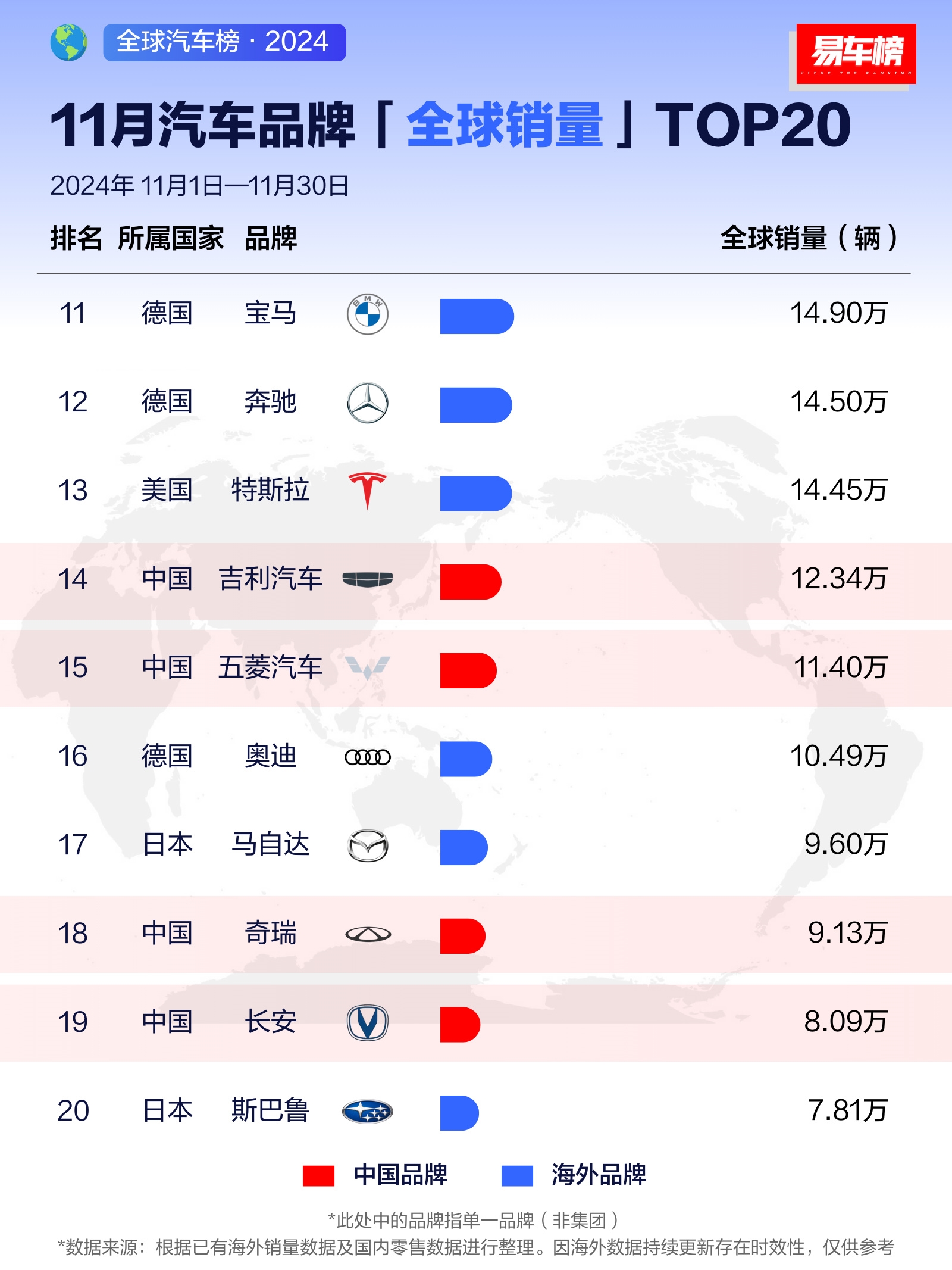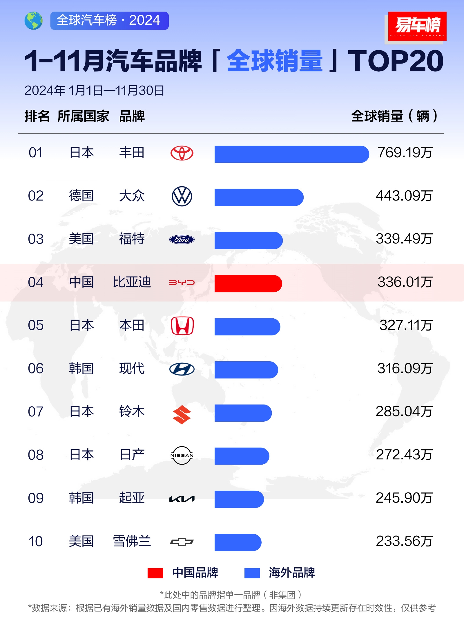 中国车企中,比亚迪累计销量为336.01万辆,位居全球第4名;吉利汽车为99.28万辆,位居第18名。