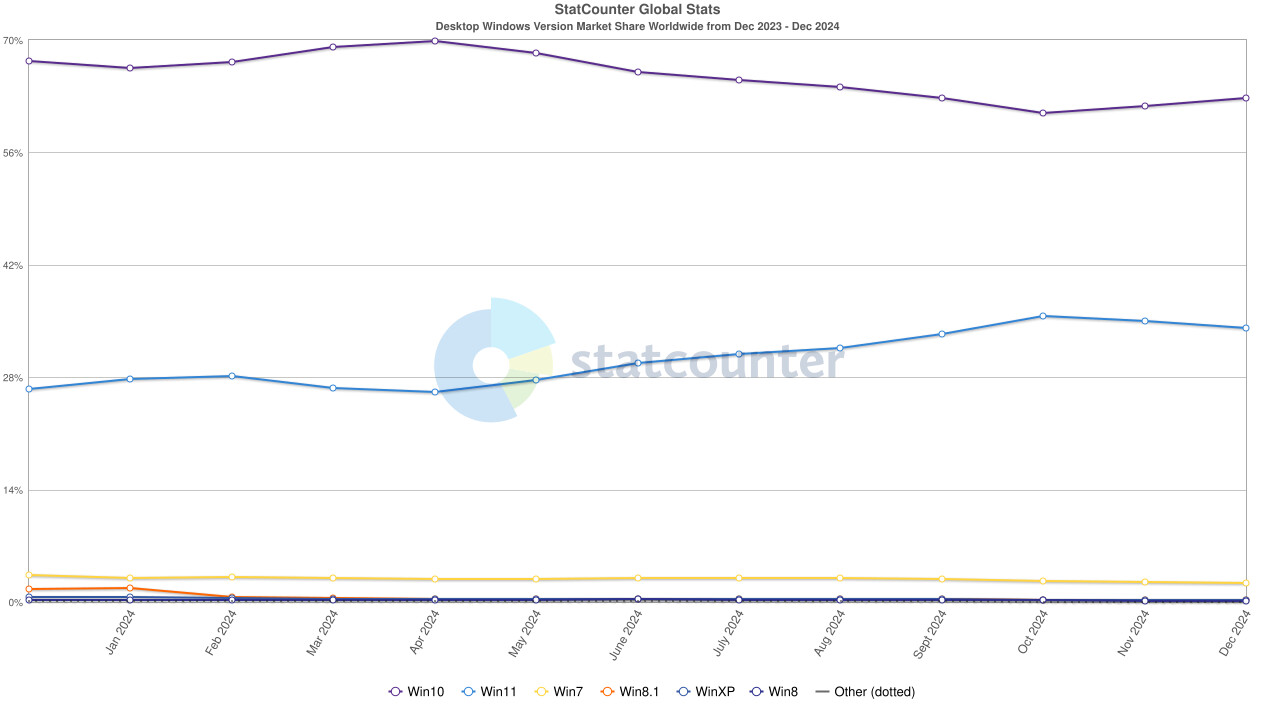 Statcounter 的最新数据显示,Windows 11 在连续两个月中损失了超过 1.48% 的市场。 2024 年 12 月,该操作系统从 34.94% 降至 34.1%(-0.84 个百分点)。 另一方面,Windows 10 虽然在不到 11 个月的时间内就将退出主流市场,但仍夺回了部分流失用户。