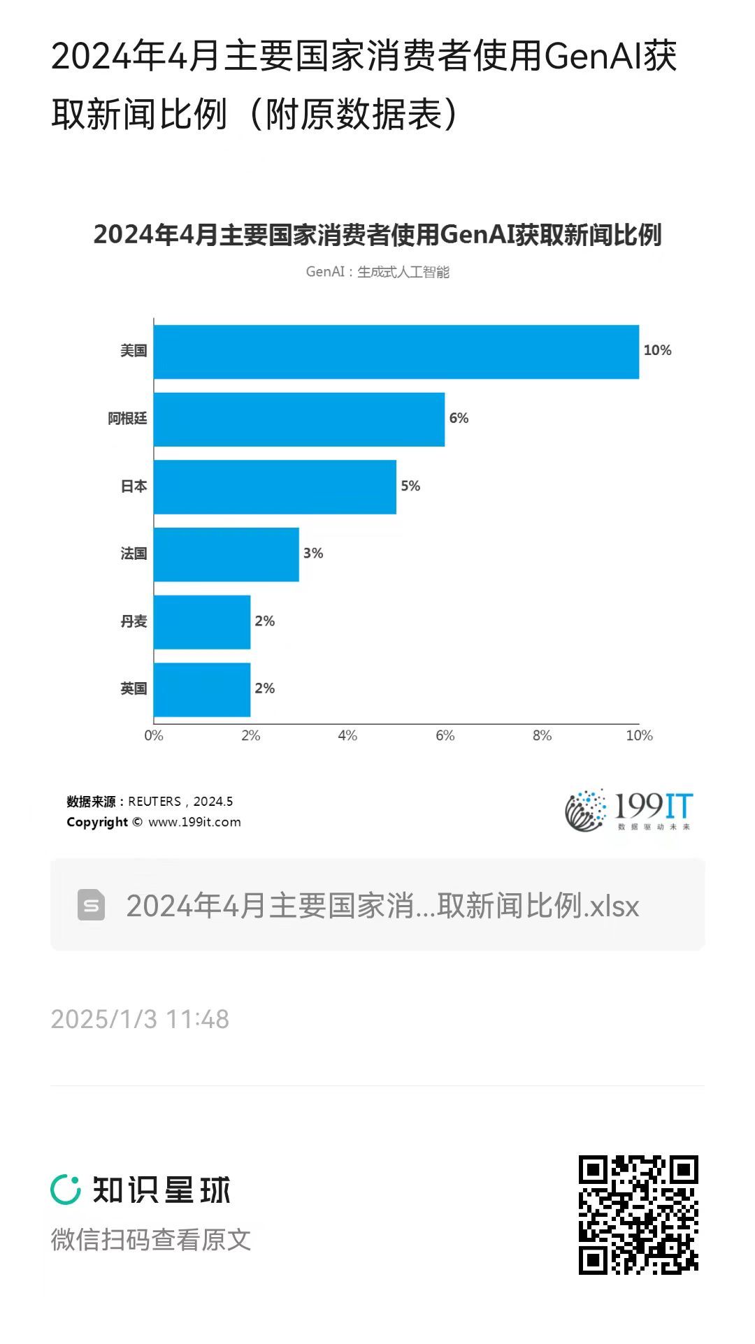 2024年4月主要国家消费者使用GenAI获取新闻比例(附原数据表) ​​​