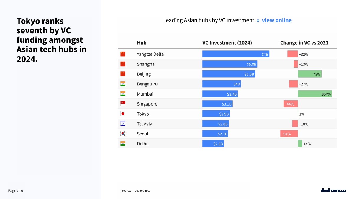 2024年,东京在亚洲科技中心的风险投资的排名是第七。