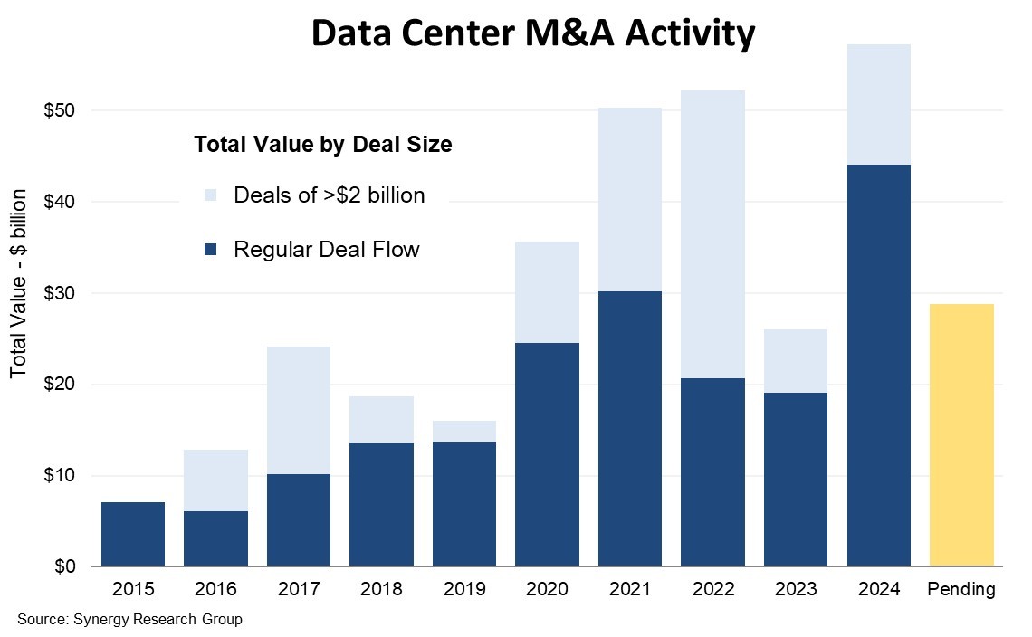 Synergy Research Group的新数据显示,在经历了2023年的相对平静之后,2024年完成的以数据中心为导向的并购交易的价值突破了500亿美元的里程碑,最终达到了570亿美元,轻松超过了之前的纪录。就所有正式完成的交易总额而言,2022年达到了520亿美元的峰值。到2023年,这一数字有所下降,总价值下降了50%,达到260亿美元。但是2022年的数字受到了该行业有史以来最大的两笔交易的提振,每笔交易的价值都达到了110亿美元或更多。如果将20亿美元或更多的巨额交易分开,那么所谓的“常规交易”的趋势就会显示出一种不同的模式。2021年是峰值,2022年下降32%,2023年再次下降,但仅下降7%,2024年跃升131%。除了在2024年完成的570亿美元交易外,还有290亿美元的交易已达成协议,但尚未正式完成。Synergy也意识到未来可能有超过150亿美元的交易,这些公司正在寻求新的资金来源或考虑战略选择。