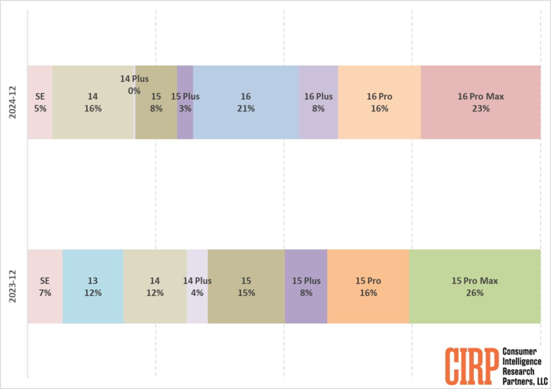 根据CIRP(消费者情报研究合作伙伴公司) 2024年12月季度数据显示,iPhone 16系列在美国的销量占比达到了68%,较去年iPhone 15系列的65%有所增长。其中,基础款iPhone 16销量占比21%,成为销售主力。