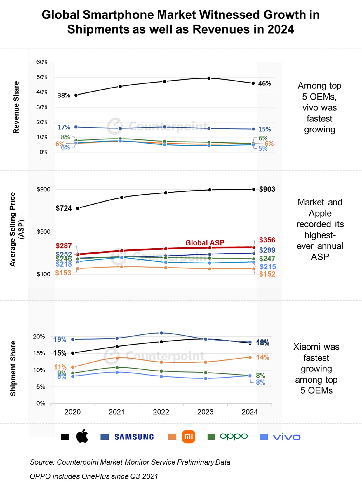 Counterpoint Research 公布的最新数据显示,2024 年全球智能手机收入份额呈现积极态势,平均销售价格指标在连续两年下滑后跃升至 356 美元。 高级分析师 Shilpi Jain 就这些变化发表了如下评论。