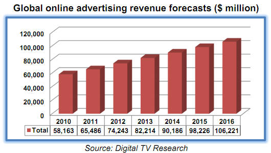 Digital TV Research今日发布研究报告称,预计到2016年全球在线广告的开支将达到近600亿美元。美国市场依然将会是全球在线广告最大的市场,不过美国市场占全球在线广告市场的份额将从2010年的41%下降到2016年的38%,因为日本和中国市场所占份额在增长。