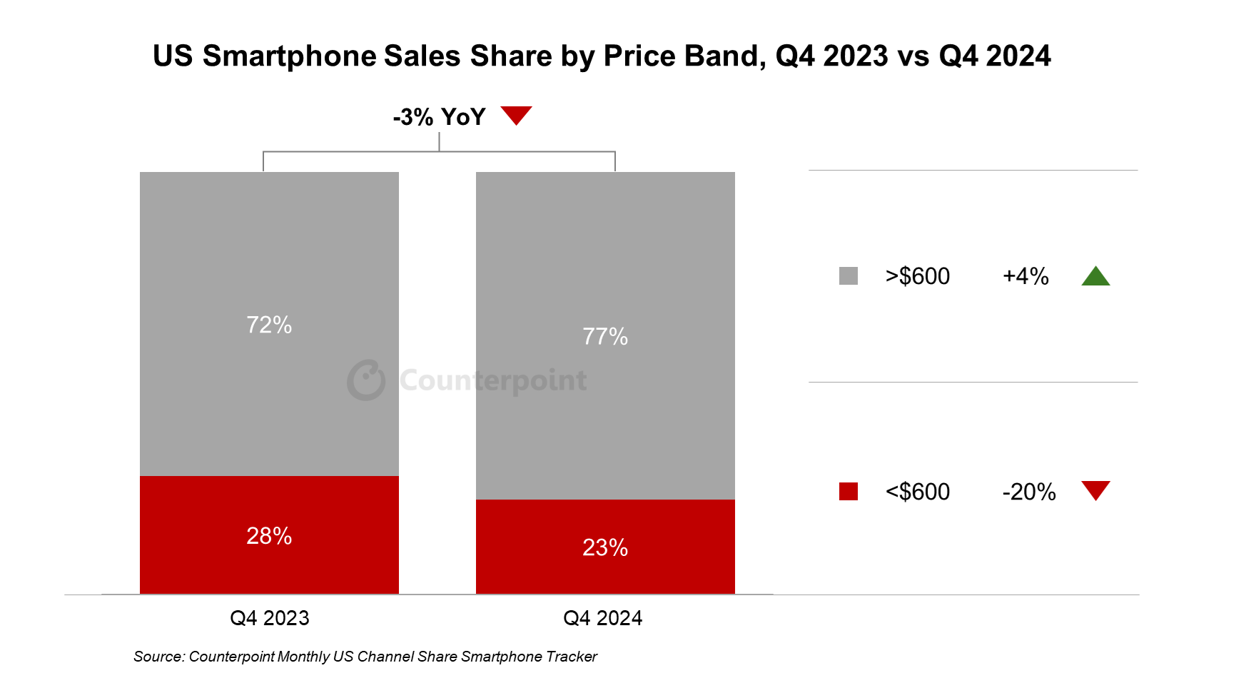 Counterpoint的报告显示,尽管运营商报告称该季度升级率有所缓解,但美国智能手机市场销量在2024年第四季度同比下降了3%。销量的下降是由于600美元以下的分支市场的销售额下降,特别是价格低于300美元的设备。由于假日季对高端智能手机的需求增加,600美元及以上价格区间的销售额同比增长了4%,这限制了美国整体市场的进一步下滑。