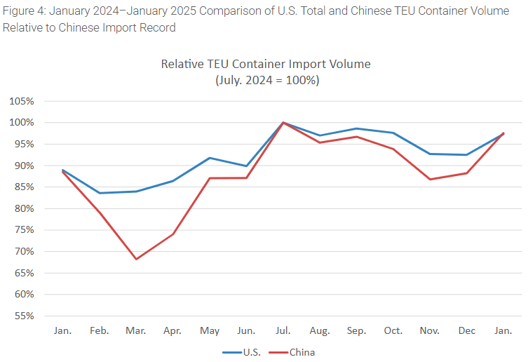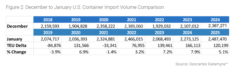 报告指出,这一增长是由于进口商抢在最近宣布并实施的对华关税前敦促发货,同时农历新年效应也产生了不小的影响——这通常会推动假期前出货量增加。笛卡尔在报告中表示,这给进口商带来了不确定性,并可能扰乱未来几个月的贸易流。