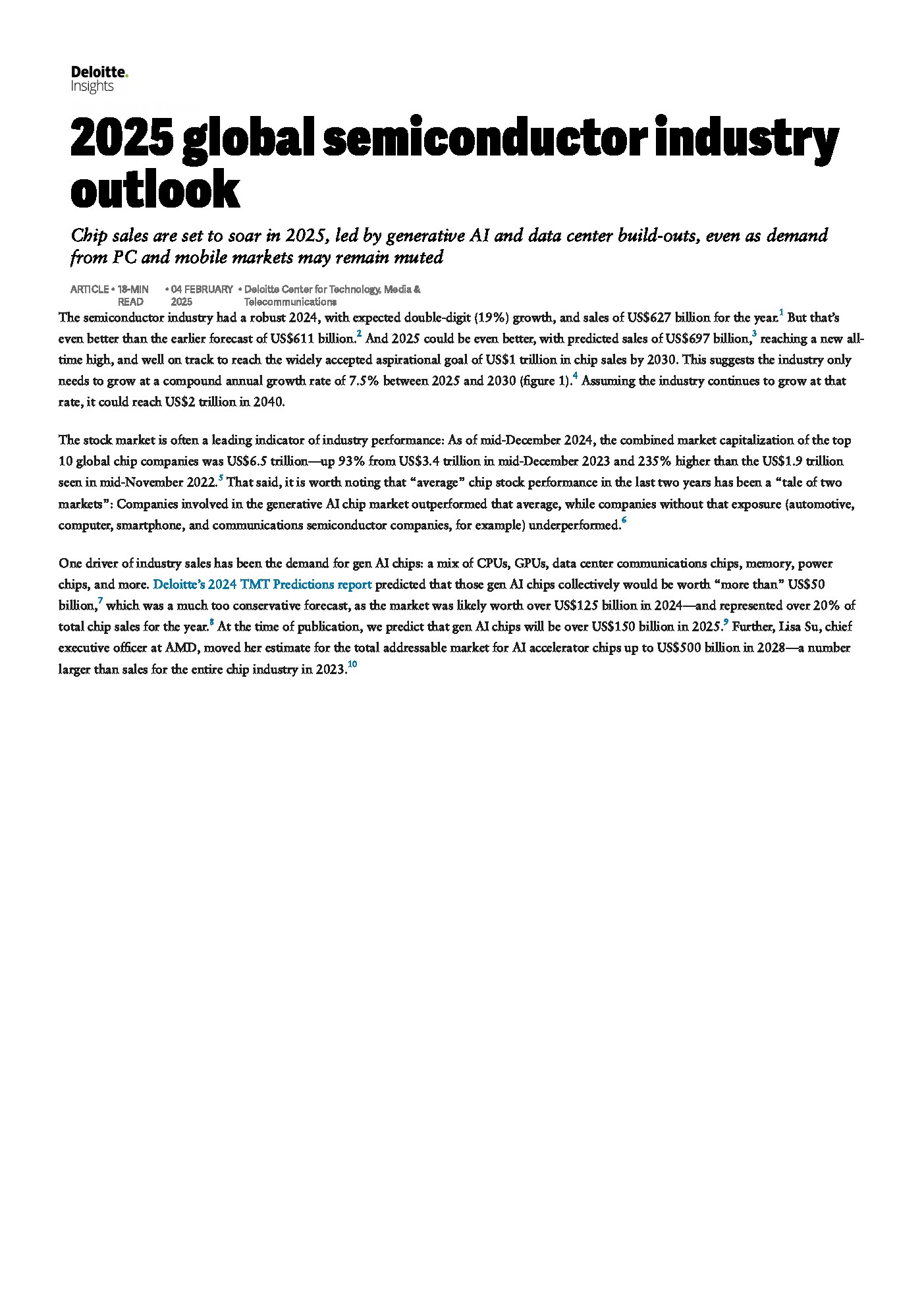2025年,在人工智能和数据中心建设的带动下,芯片销售将大幅增长,尽管个人电脑和移动市场的需求可能会保持低迷。