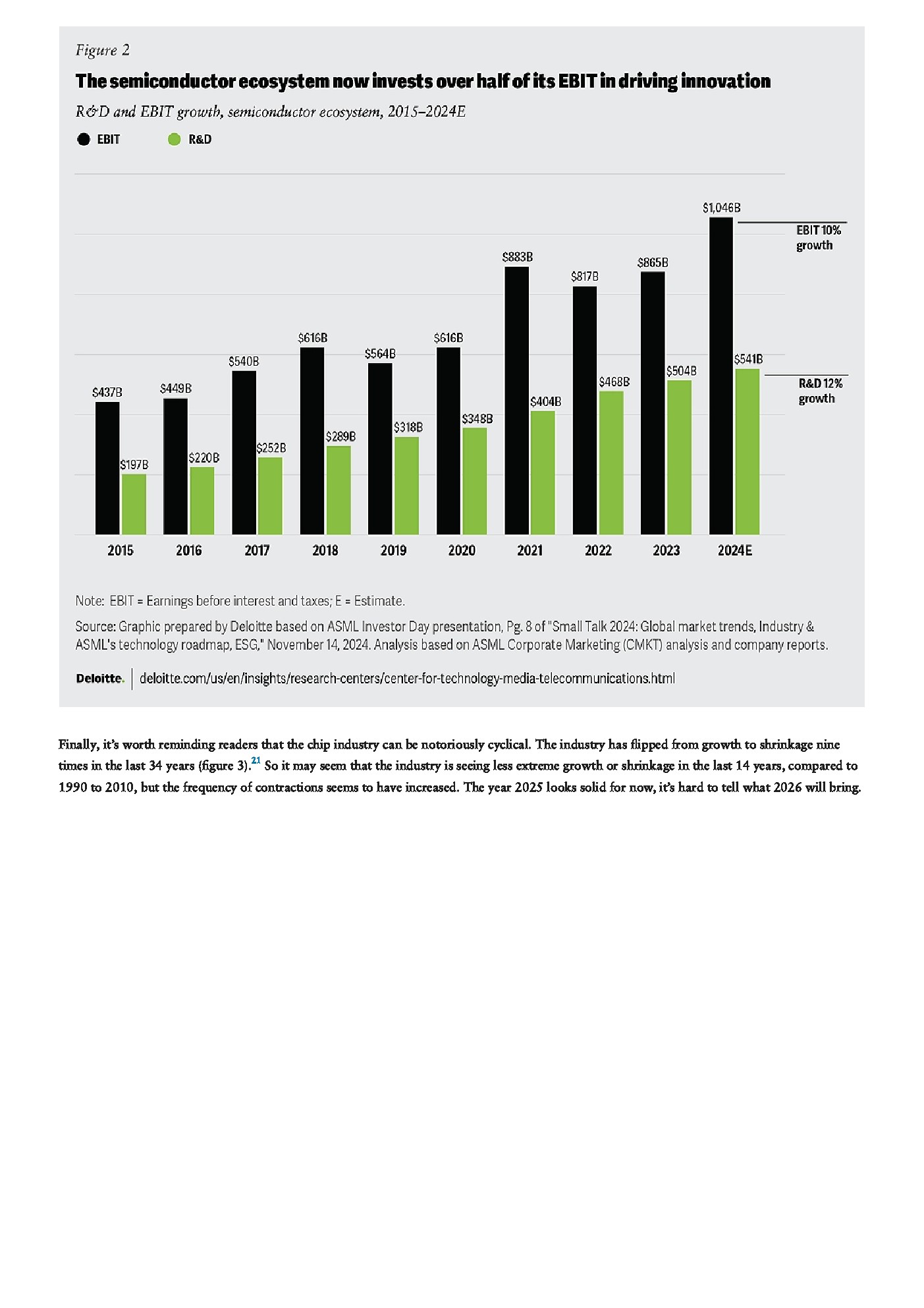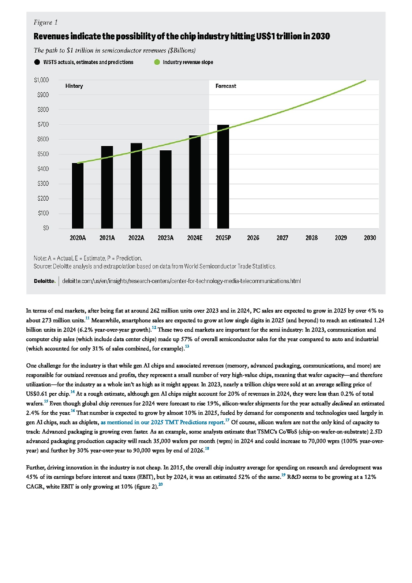 2025年可能会更好,预计销售额将达到6970亿美元,创下历史新高,并有望实现到2030年芯片销售额达到1万亿美元的普遍目标。在2025年至2030年期间,该行业将以7.5%的复合年增长率增长。假设该行业继续以这一速度增长,2040年该行业的规模将达到2万亿美元。