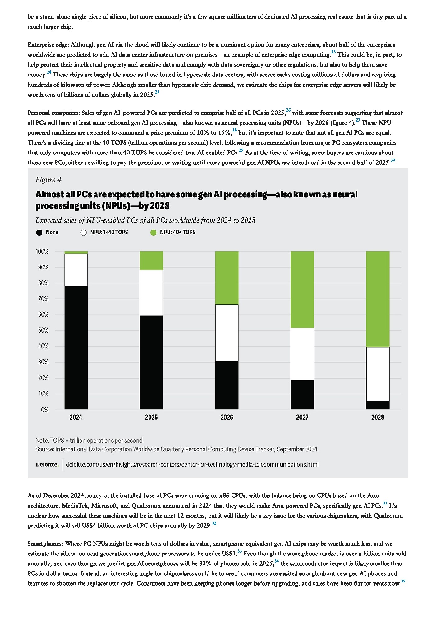 推动行业销售的一个因素是对通用人工智能芯片的需求:包括CPU、GPU、数据中心通信芯片、内存、电源芯片等。德勤的2024年TMT预测,这些新一代人工智能芯片的总价值将“超过”500亿美元,这是一个过于保守的预测,因为2024年市场价值可能超过1250亿美元,占当年芯片总销售额的20%以上。预计2025年,人工智能芯片的价值将超过1500亿美元。