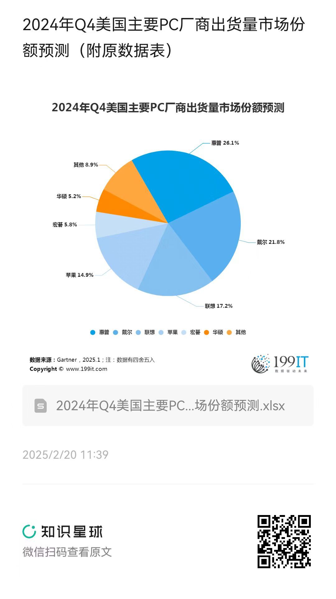 - 2025年Q1美国主要PC厂商出货量市场份额预测(附原数据表)