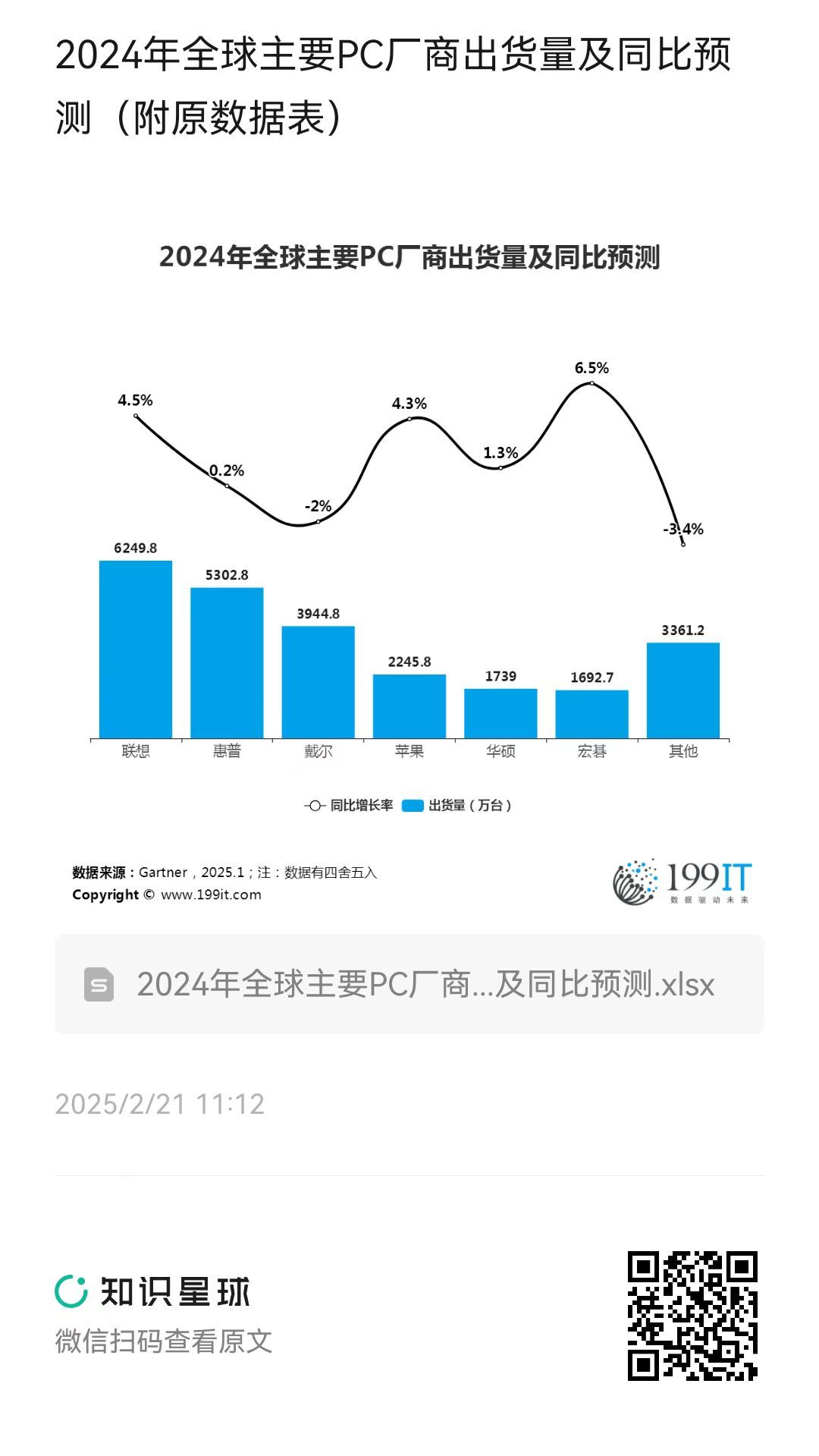 - 2024年Q4全球主要PC厂商出货量及同比预测(附原数据表)