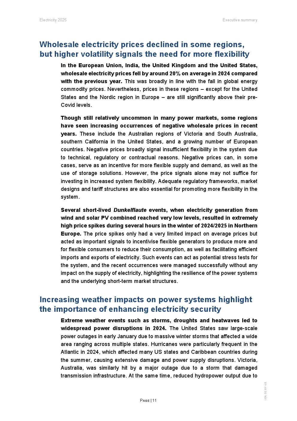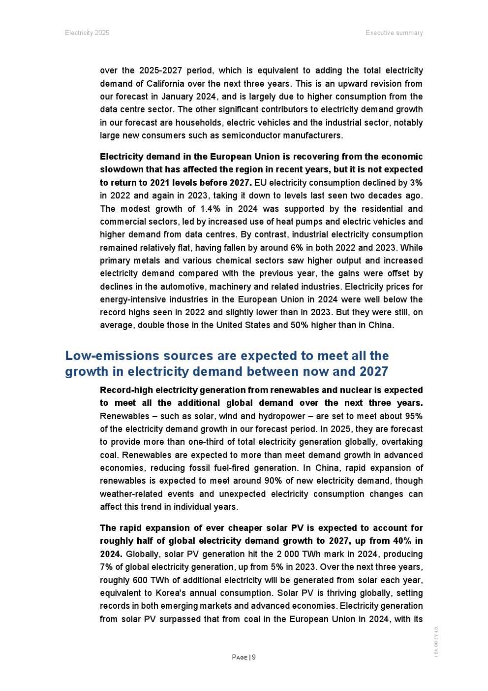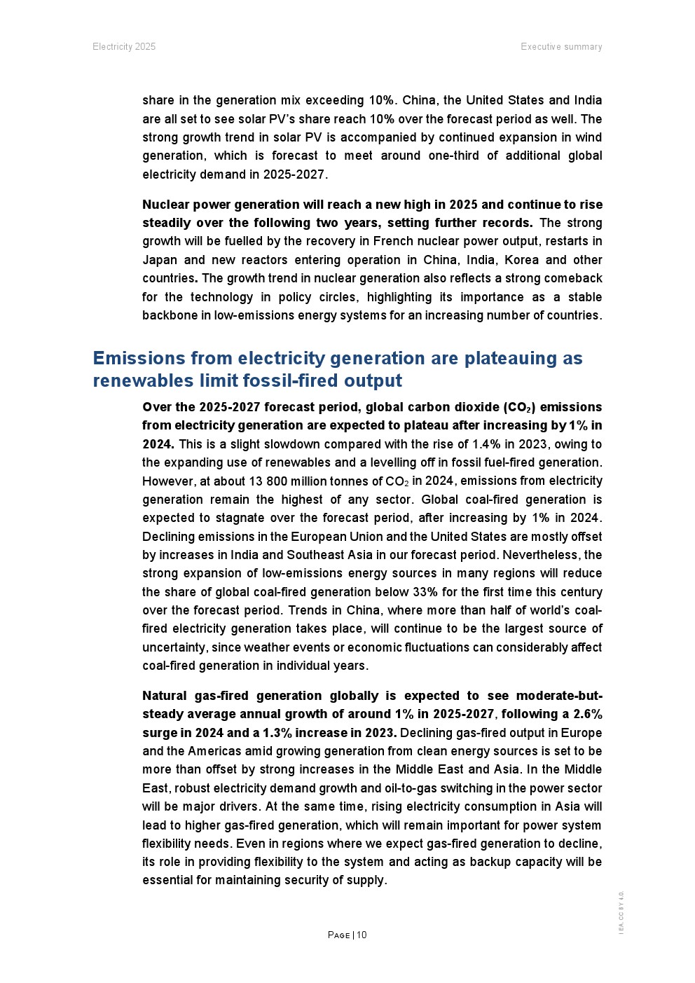 报告预测,低排放能源(主要是可再生能源和核能)的增长总体上足以满足未来三年全球电力需求的全部增长。特别是,在成本持续下降和政策支持的情况下,太阳能光伏发电预计将满足2027年全球电力需求增长的大约一半。2024年,欧盟的太阳能光伏发电量超过了煤炭发电量,太阳能占电力结构的比例超过10%。预计从现在到2027年,中国、美国和印度的太阳能光伏发电在年度发电量中的占比都将达到10%。与此同时,核能正在强势回归,其发电量预计从2025年起在预测期内每年创下新高。由于这些预测趋势,全球发电产生的二氧化碳排放量预计在未来几年将趋于平稳,此前在2024年增长了约1%。
