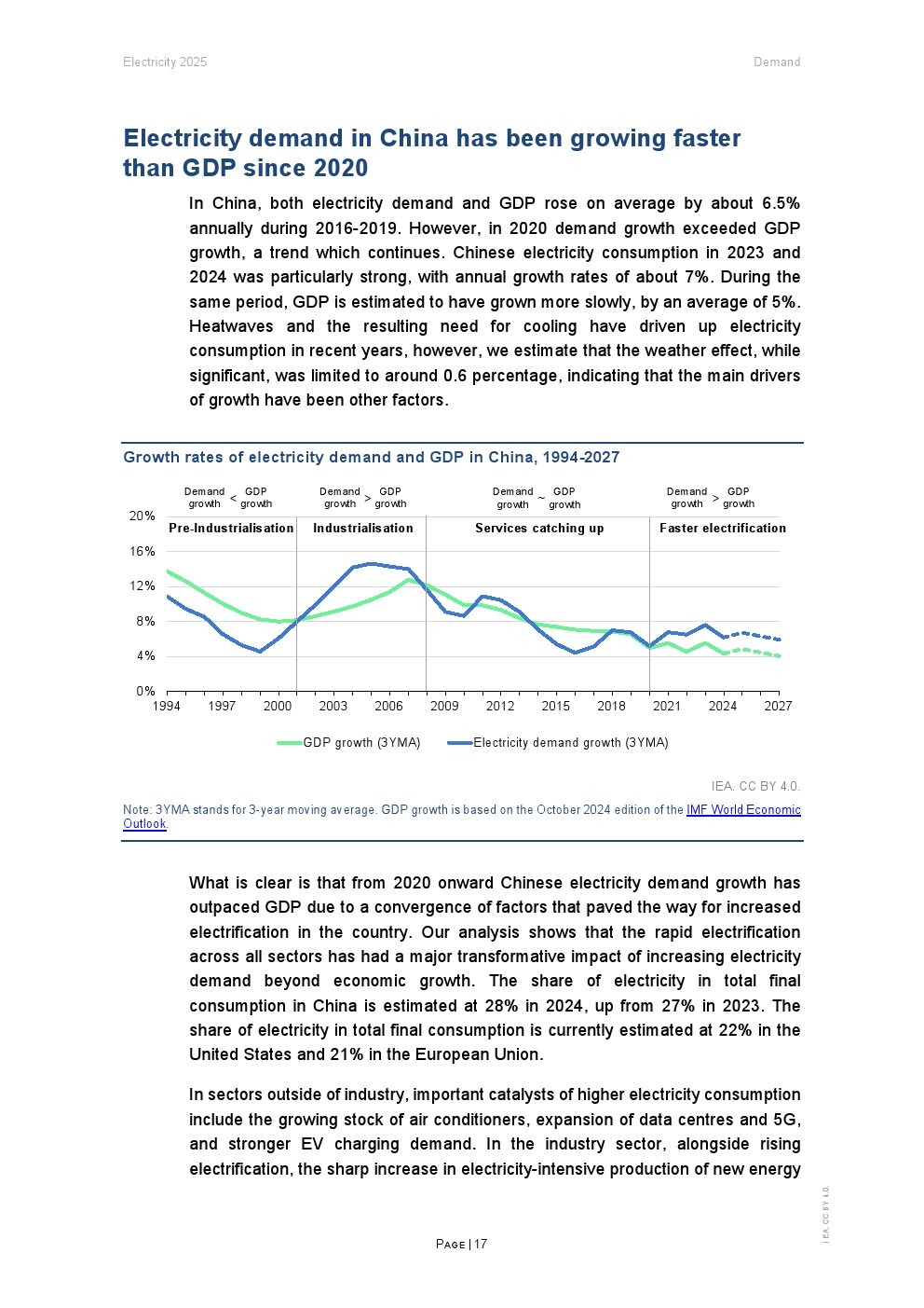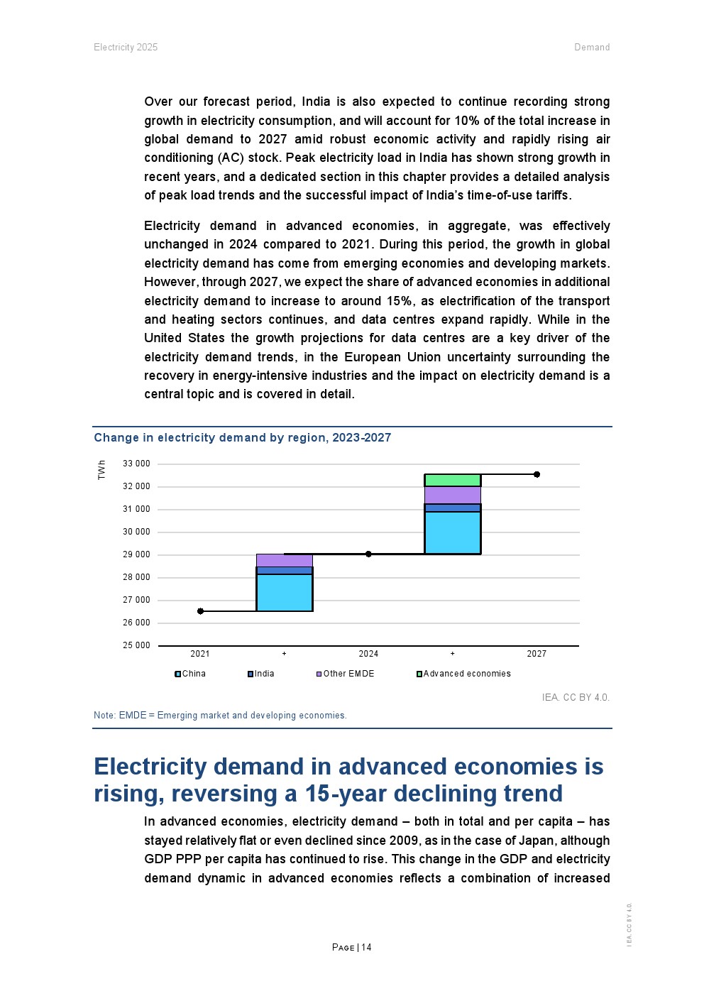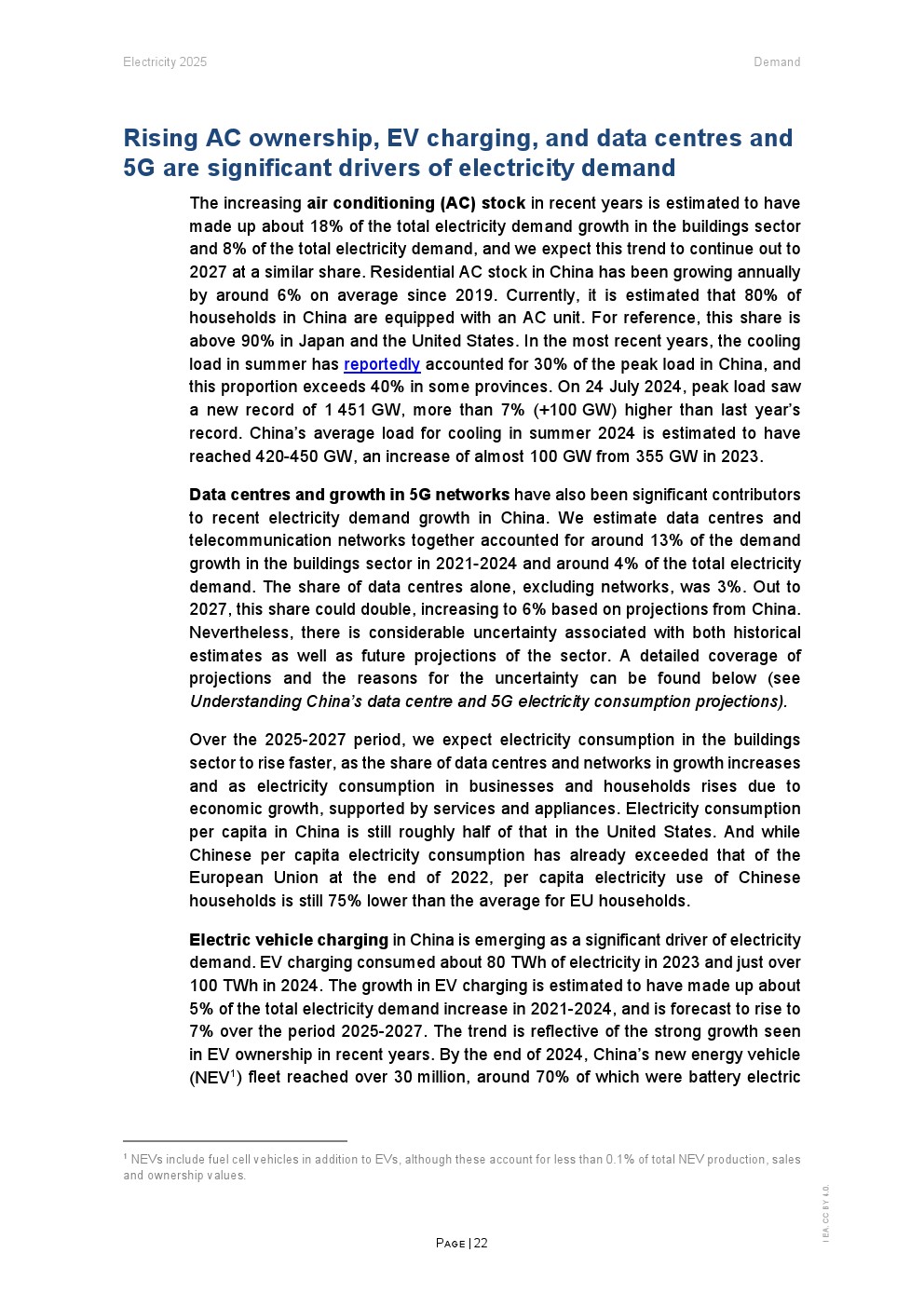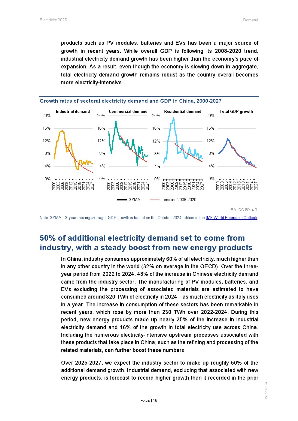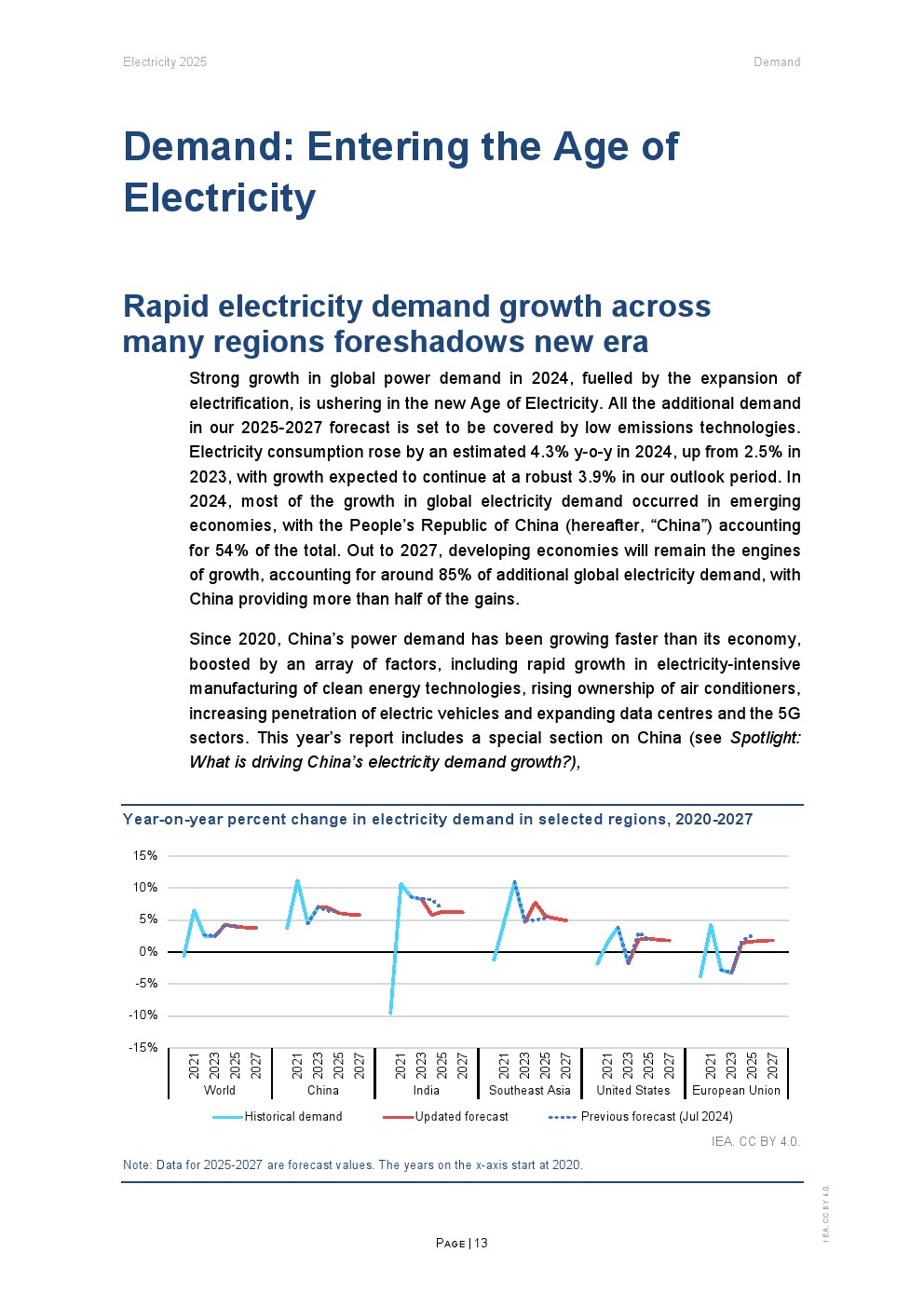 未来三年,大部分新增需求将来自新兴和发展中经济体,这些经济体占需求增长的85%。这一趋势在中国最为显著,自2020年以来,中国的电力需求增长速度一直快于整体经济增长。2024年,中国的电力消费增长了7%,预计2027年年均增长约6%。中国需求增长的部分动力来自工业领域,除了传统的能源密集型行业外,太阳能电池板、电池、电动汽车及相关材料的电力密集型制造业的快速扩张也发挥了重要作用。空调、电动汽车的普及、数据中心和5G网络也是推动因素之一。