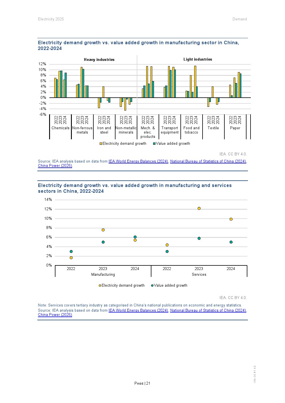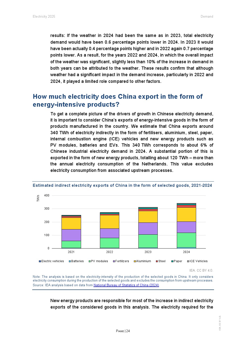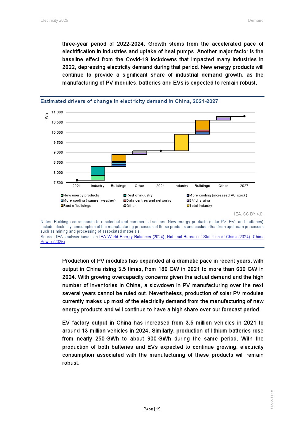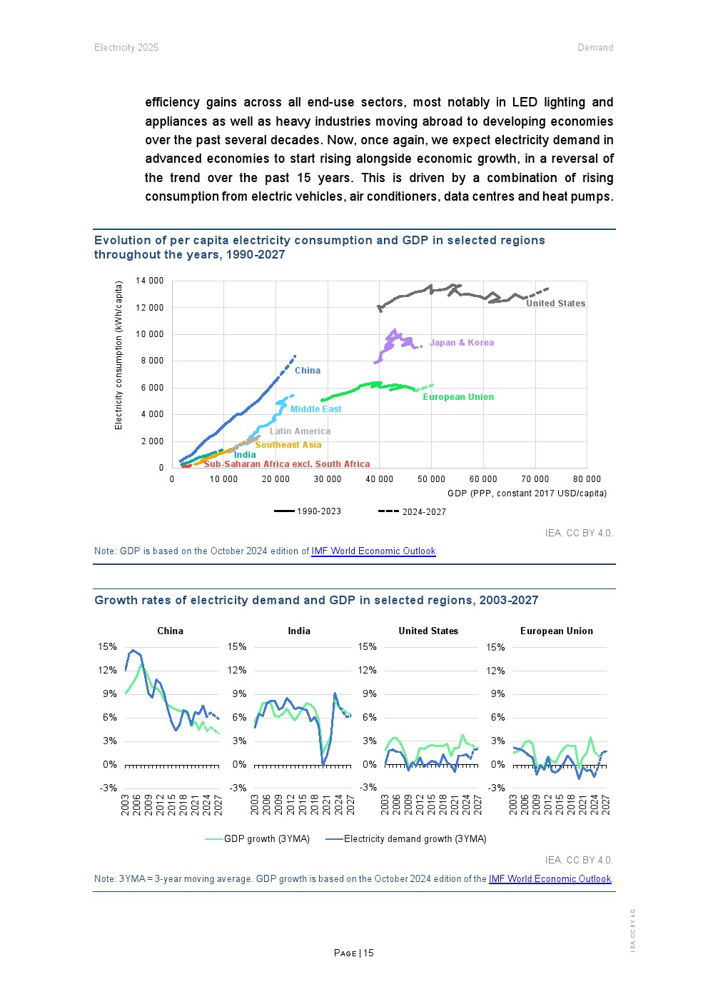 未来三年,大部分新增需求将来自新兴和发展中经济体,这些经济体占需求增长的85%。这一趋势在中国最为显著,自2020年以来,中国的电力需求增长速度一直快于整体经济增长。2024年,中国的电力消费增长了7%,预计2027年年均增长约6%。中国需求增长的部分动力来自工业领域,除了传统的能源密集型行业外,太阳能电池板、电池、电动汽车及相关材料的电力密集型制造业的快速扩张也发挥了重要作用。空调、电动汽车的普及、数据中心和5G网络也是推动因素之一。