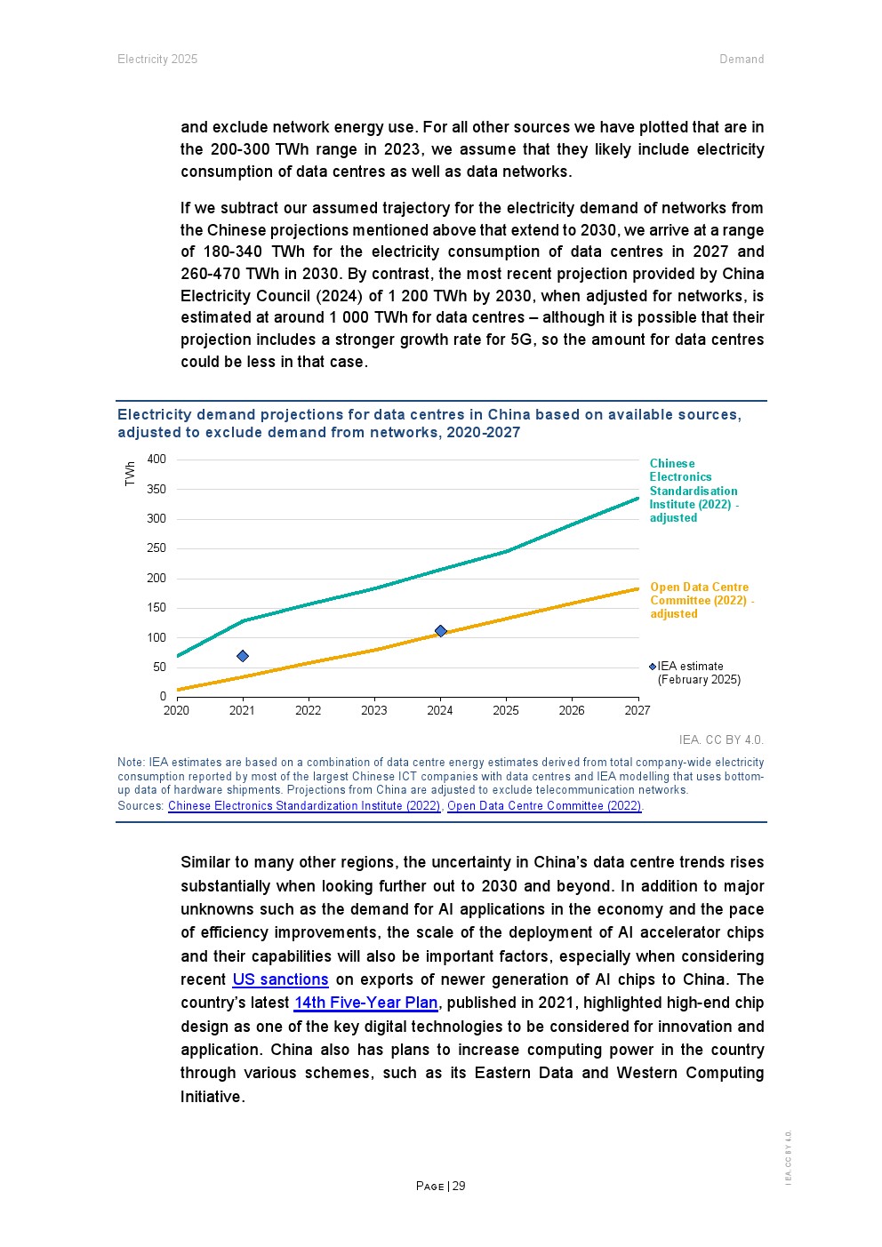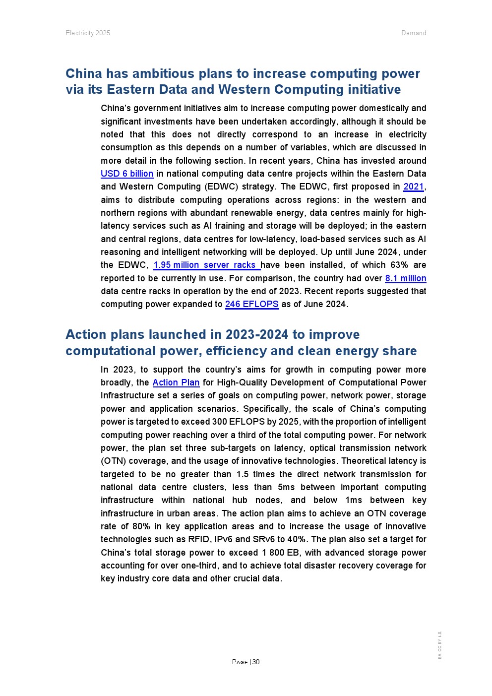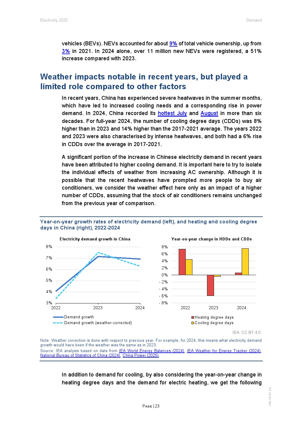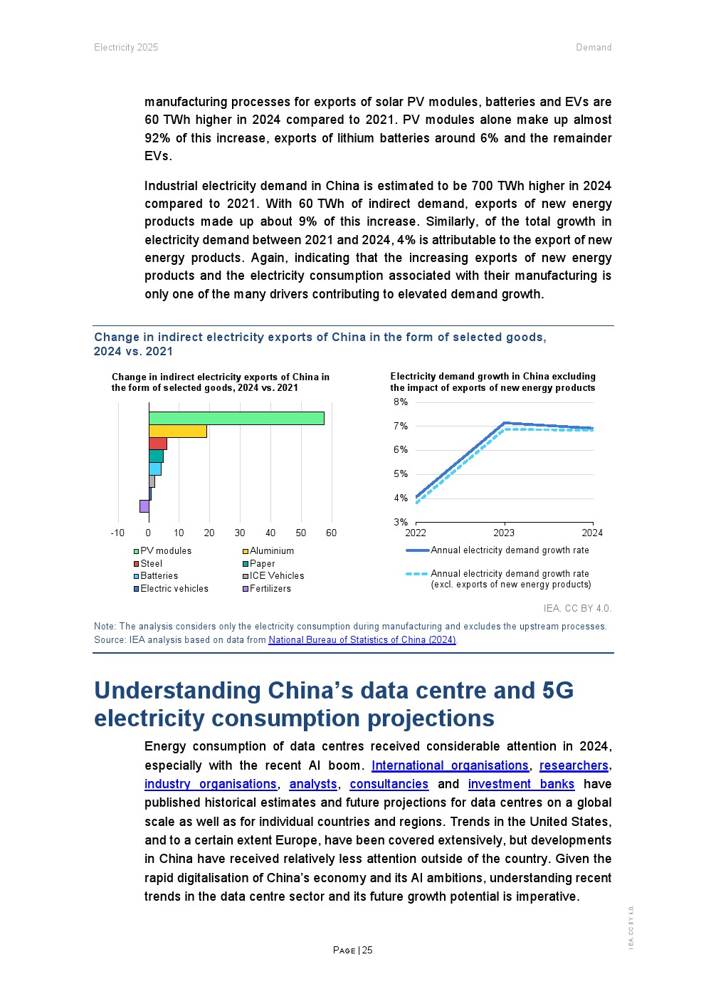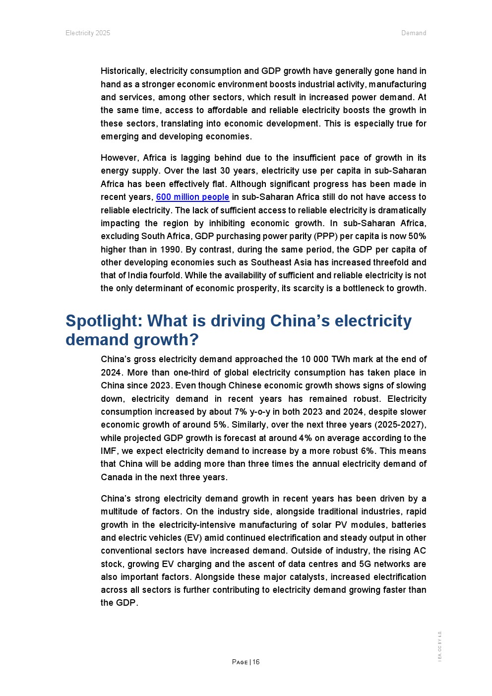 未来三年,大部分新增需求将来自新兴和发展中经济体,这些经济体占需求增长的85%。这一趋势在中国最为显著,自2020年以来,中国的电力需求增长速度一直快于整体经济增长。2024年,中国的电力消费增长了7%,预计2027年年均增长约6%。中国需求增长的部分动力来自工业领域,除了传统的能源密集型行业外,太阳能电池板、电池、电动汽车及相关材料的电力密集型制造业的快速扩张也发挥了重要作用。空调、电动汽车的普及、数据中心和5G网络也是推动因素之一。