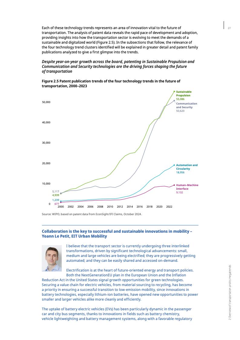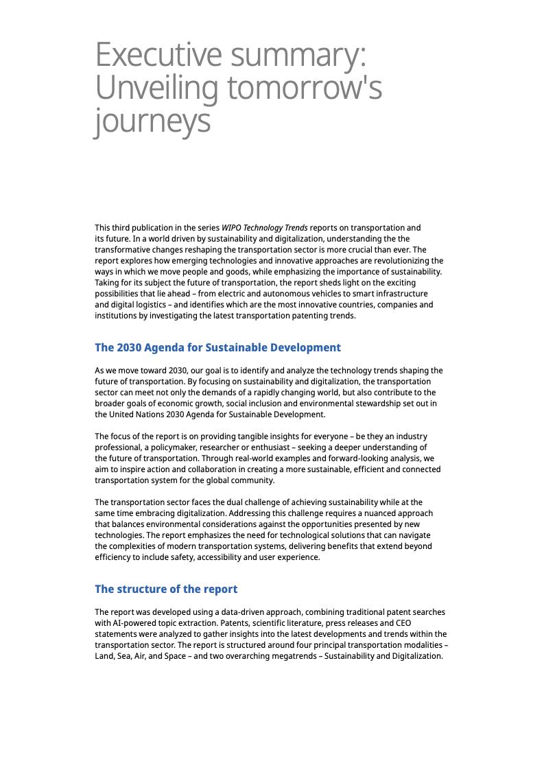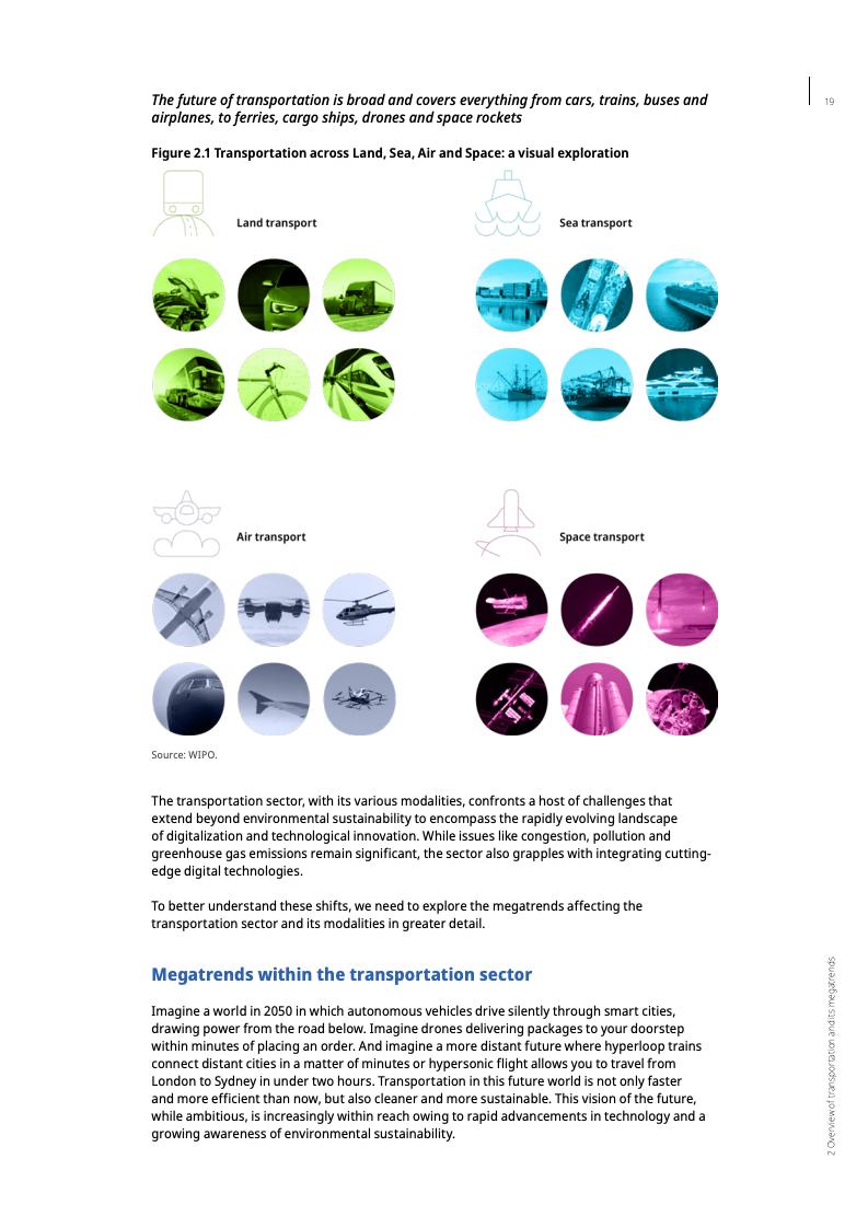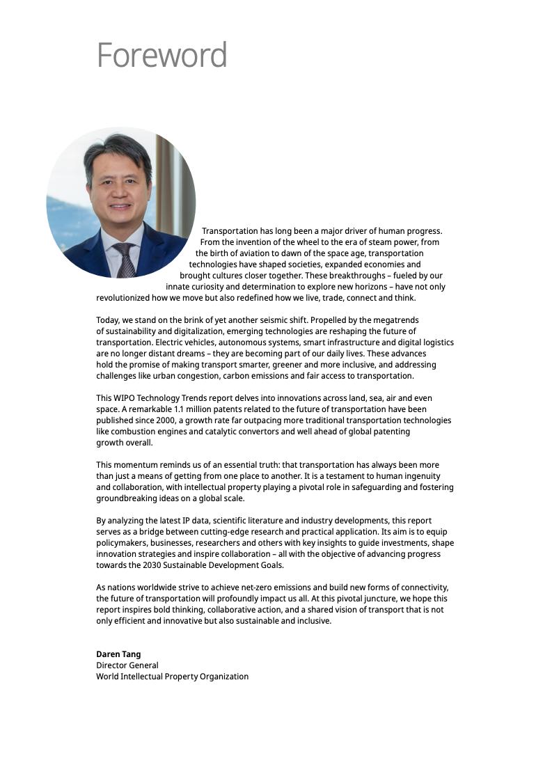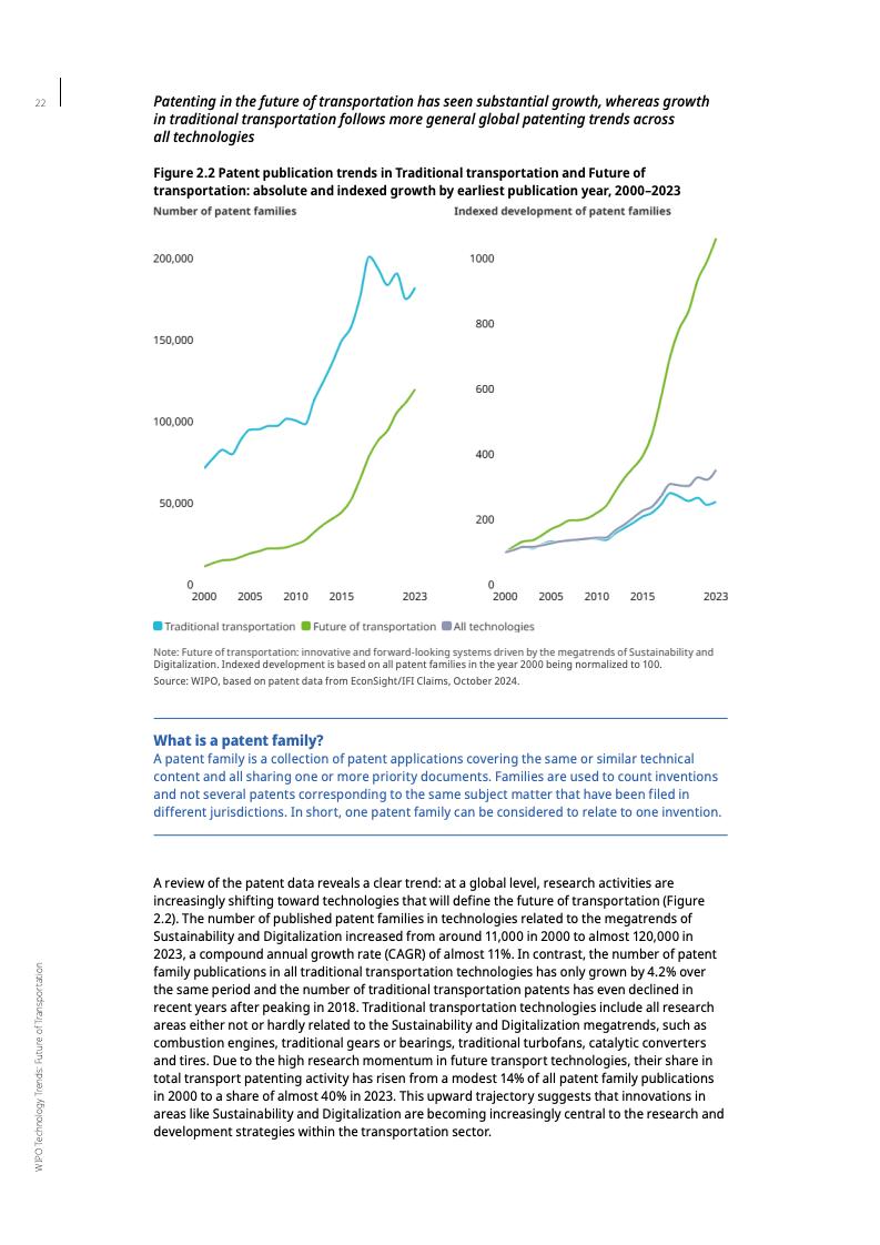 报告显示,截至2023年,未来交通领域的专利年均增长率达11%,是全球专利增长率的两倍多。这一趋势凸显了交通运输业的经济和环境重要性。交通运输业在许多国家的国内生产总值中占比高达6%至12%,并贡献了约23%的年度能源相关碳排放。