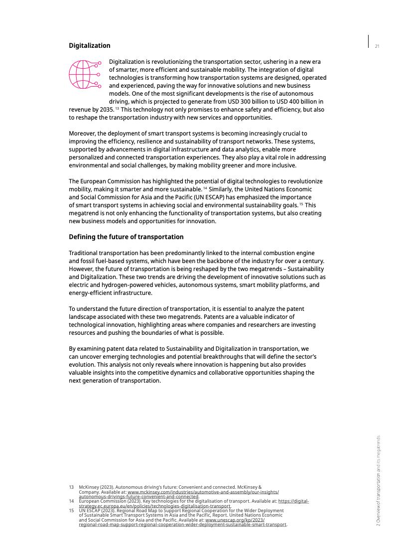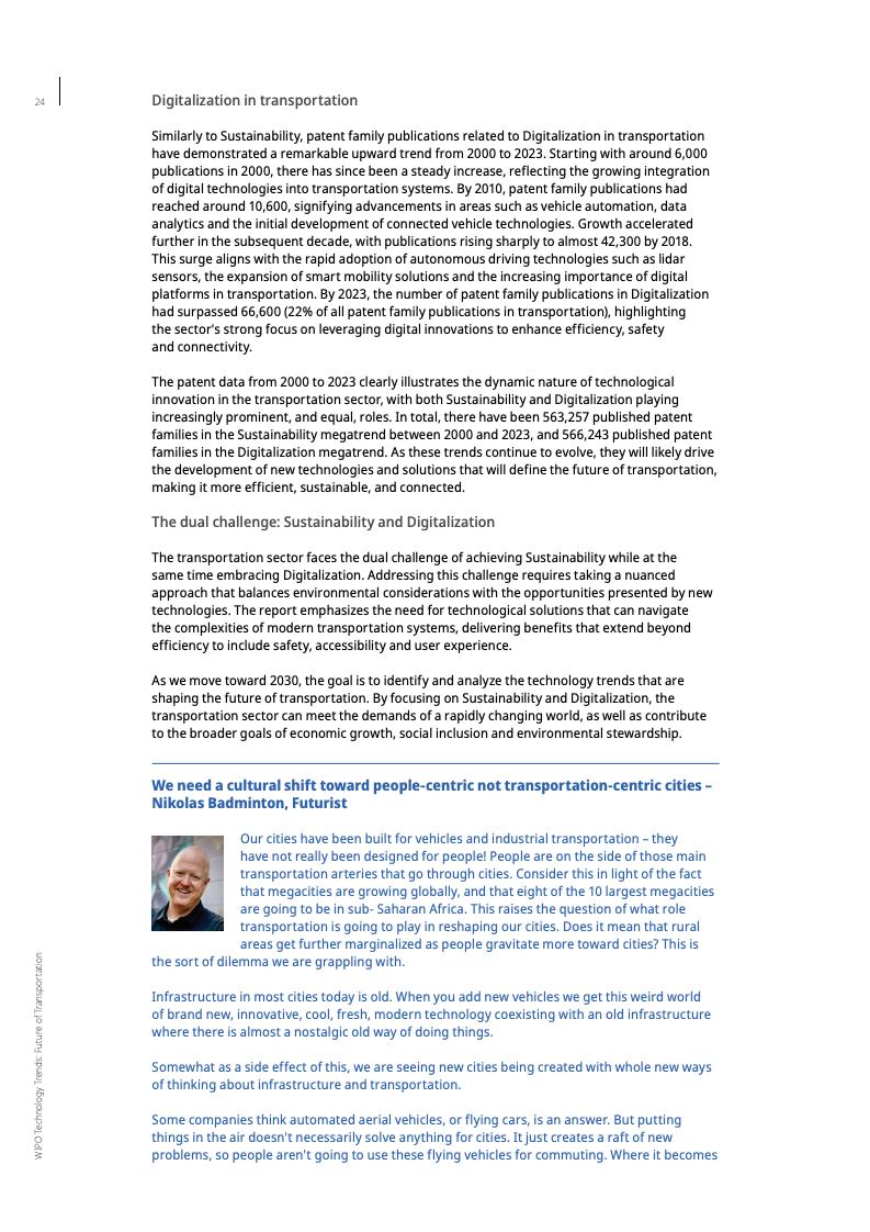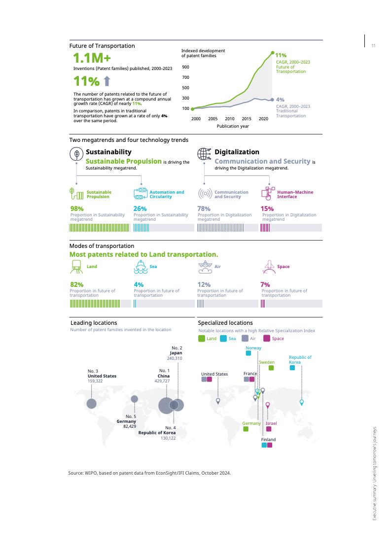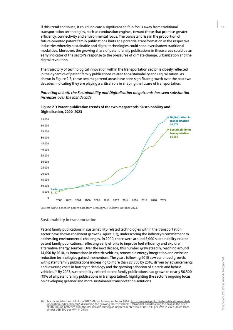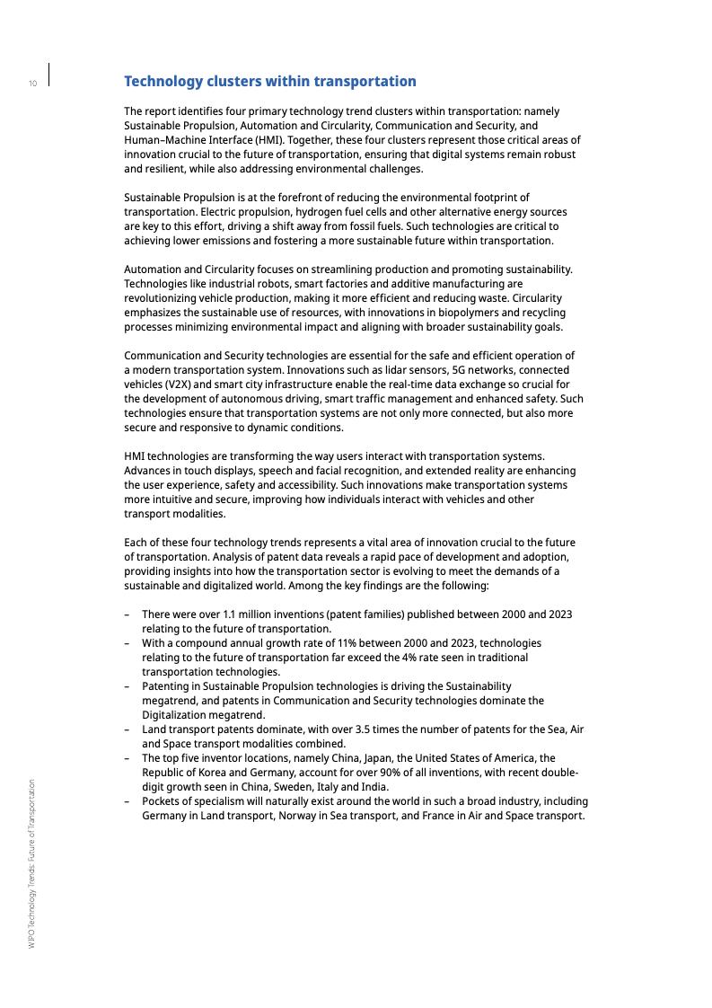 报告显示,截至2023年,未来交通领域的专利年均增长率达11%,是全球专利增长率的两倍多。这一趋势凸显了交通运输业的经济和环境重要性。交通运输业在许多国家的国内生产总值中占比高达6%至12%,并贡献了约23%的年度能源相关碳排放。
