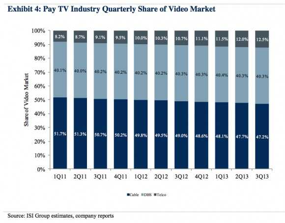现在的趋势是朝着相反的方向走。有线电视订户从2010年初的4450万,下滑到了目前的4000万户。而AT&T和Verizon等电信业者,却收获了越来越多的付费电视份额。