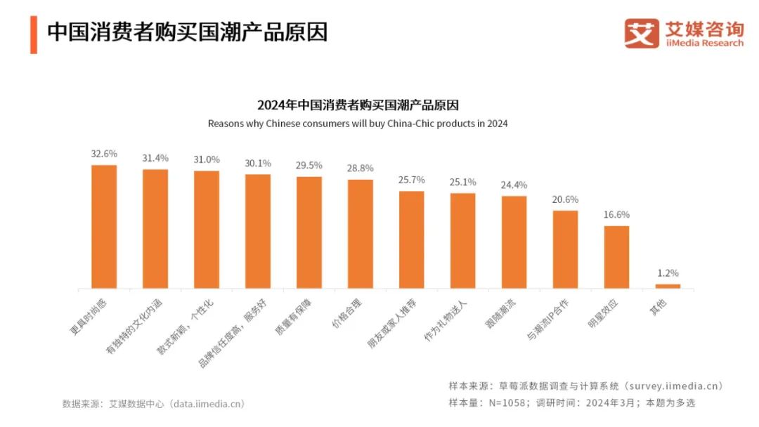 iiMedia Research(艾媒咨询)调研数据显示,消费者购买国潮产品的主要原因是产品更具时尚感及具有独特的文化内涵,占比分别为 32.6% 和 31.4%。国潮产品时尚及个性化的设计能够贴合中国消费者的文化、审美及使用需求,受到众多消费者的青睐。