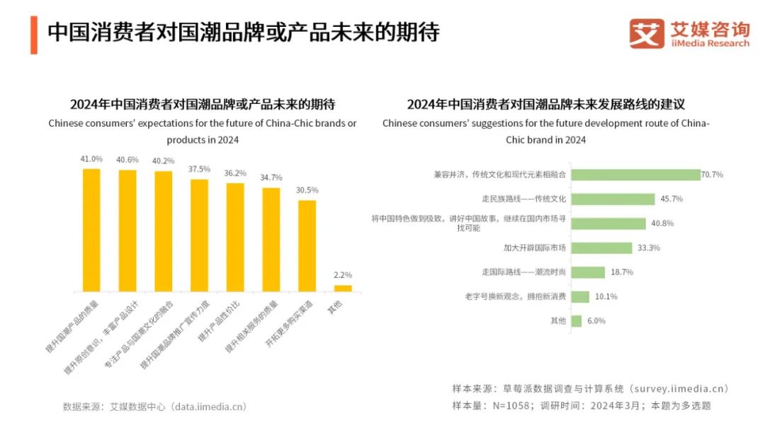 iiMedia Research(艾媒咨询)调研数据显示,消费者期望国潮品牌未来能够提升产品质量、丰富产品设计。70.7% 的消费者建议国潮品牌未来能够兼容并济,将传统文化和现代元素相融合,建立品牌文化,提升品牌核心竞争力。