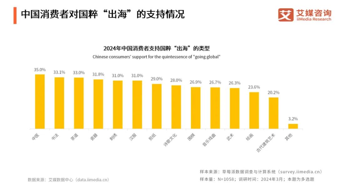 iiMedia Research(艾媒咨询)调研数据显示,消费者对中医、书法、茶道等传统文化 “出海” 传播较为期待。随着中国经济的快速发展和国际地位的提升,中国消费者对于本土文化的自豪感也在不断增强,文化出海为国货品牌的发展提供了更大的市场空间。
