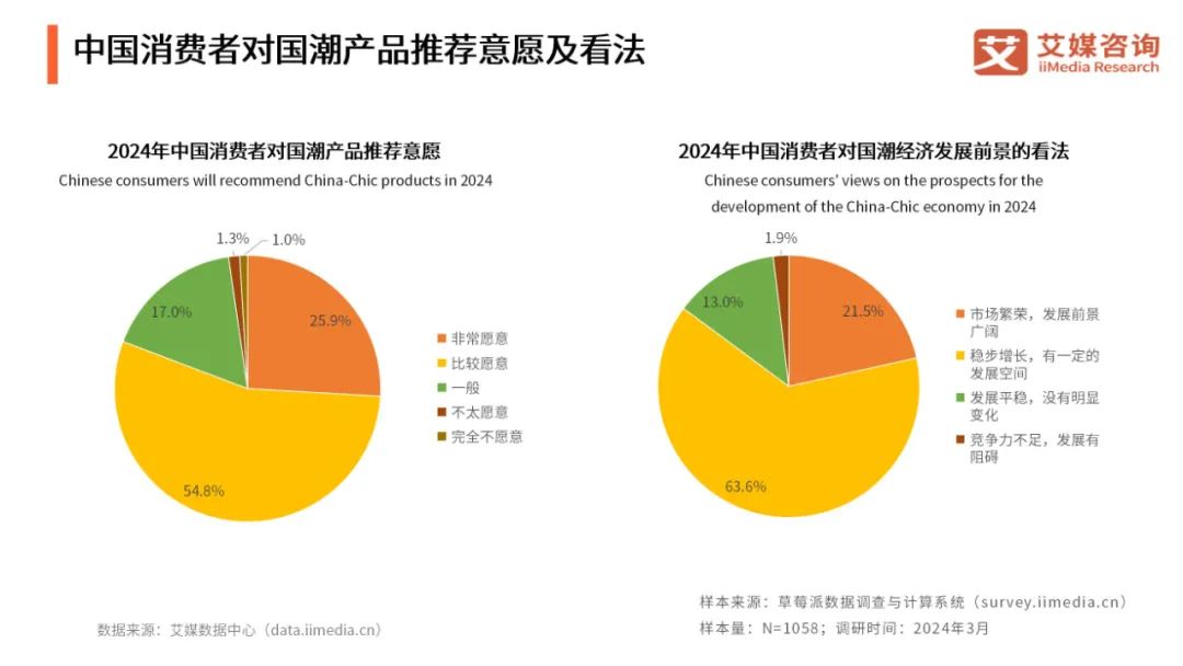iiMedia Research(艾媒咨询)调研数据显示,消费者对国潮产品的推荐意愿较高,85.1% 的消费者对国潮经济的发展前景表示看好。随着国潮品牌的知名度及质量的提升,将会有更多的消费者认可并支持国潮产品。