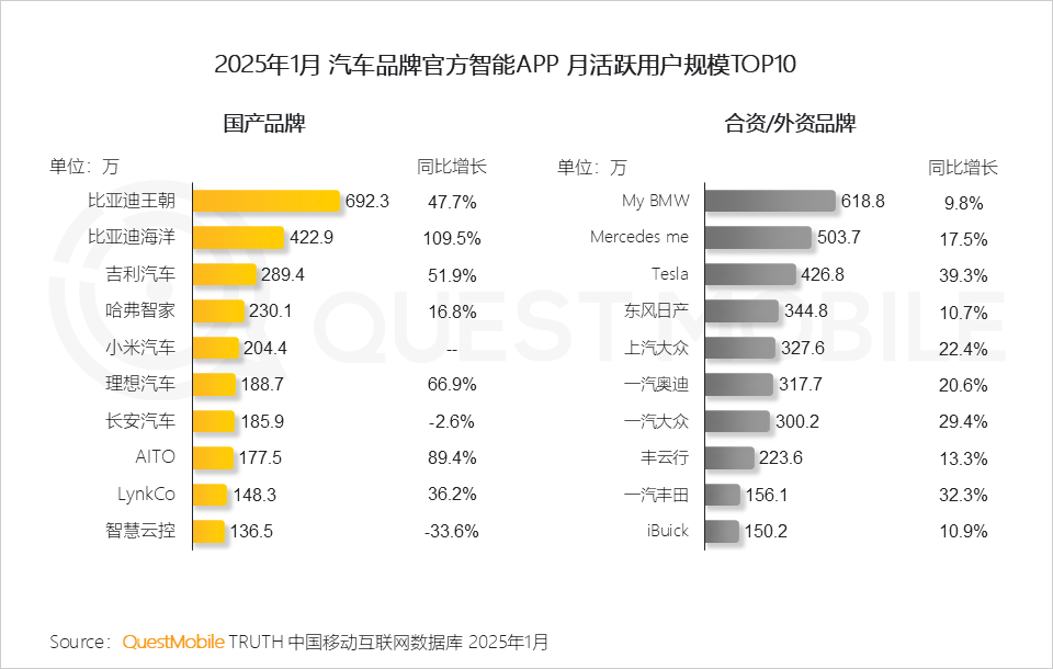 在当今智能化时代,智能汽车APP已然成为车主用车过程中不可或缺的核心助手。据QuestMobile所发布的数据显示,截至2025年1月,在国产品牌汽车智能APP月活跃用户规模的排行榜中,比亚迪表现极为亮眼,强势霸榜前两名。
