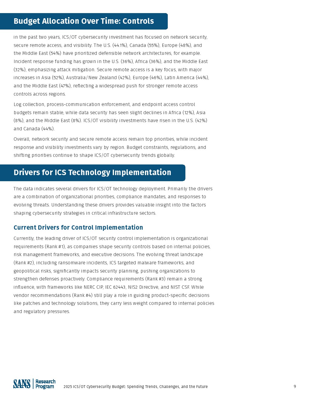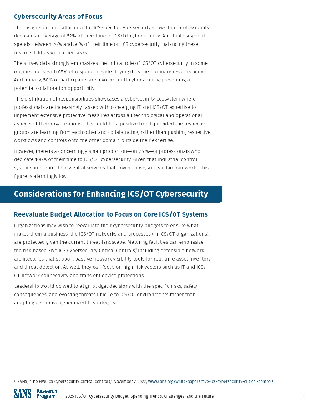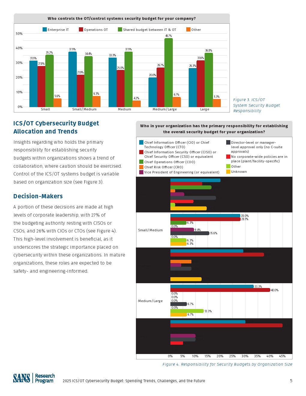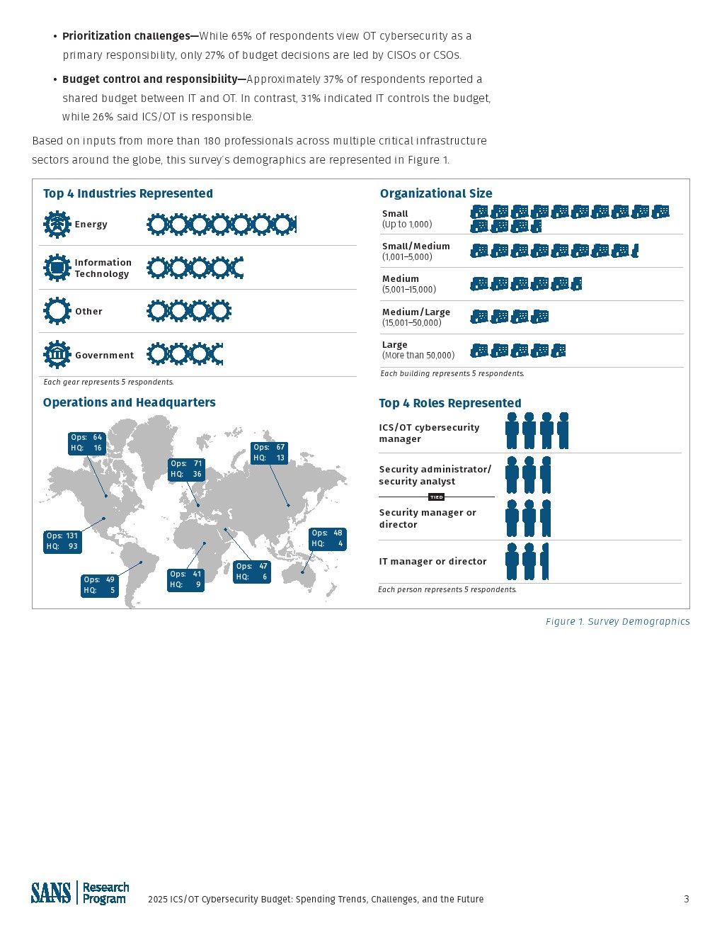 优先事项挑战——虽然65%的受访者将OT网络安全视为主要责任,但只有27%的预算决策由首席信息安全官(CISO)或首席安全官(CSO)主导。