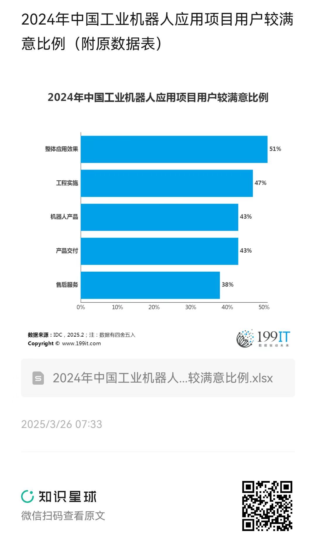 2024年中国工业机器人应用项目用户较满意比例(附原数据表) 更多阅读:2010-2019年全球工业机器人地区分布情况(附原数据表)2009-2019年全球工业机器人存量及增长率(附原数据表) 2018年-2023年全球工业机器人运行数量(附原数据表) 2024年中国工业机器人应用项目用户不满意比例(附原数据表) 2023年中国工业机器人出口收入市场份额(附原数据表) IFR:2023年全球工业机器人市场将增长7%中国成为全球最大工业机器人市场–信息图工信部:中国工业机器人保有量已占全球1/4国际机器人联合会:2022年中国每万名员工操作322台机器人IFR:2023年协作机器人占全球工业机器人安装量的10.5%国际机器人联合会:2020年全球工业机器人报告IFR:2023年全球工业机器人密度达到每万名员工162台Omdia:工业机器人和自动化信息服务终端用户调查全球最大的工业机器人市场在哪儿?IFR:2022年每1万名中国员工对应392台机器人