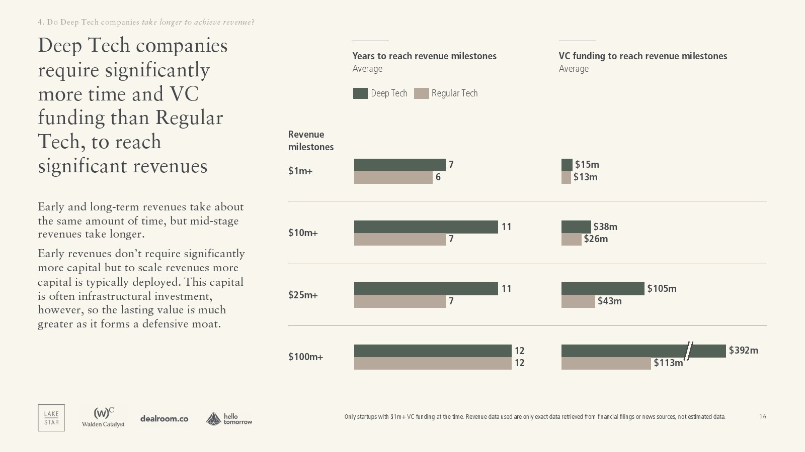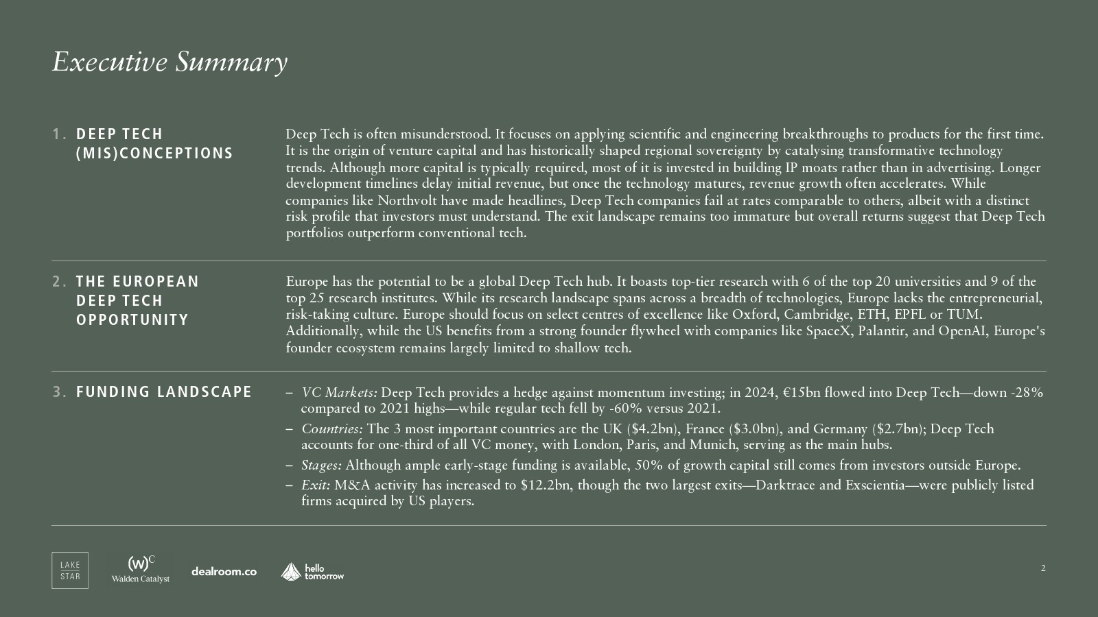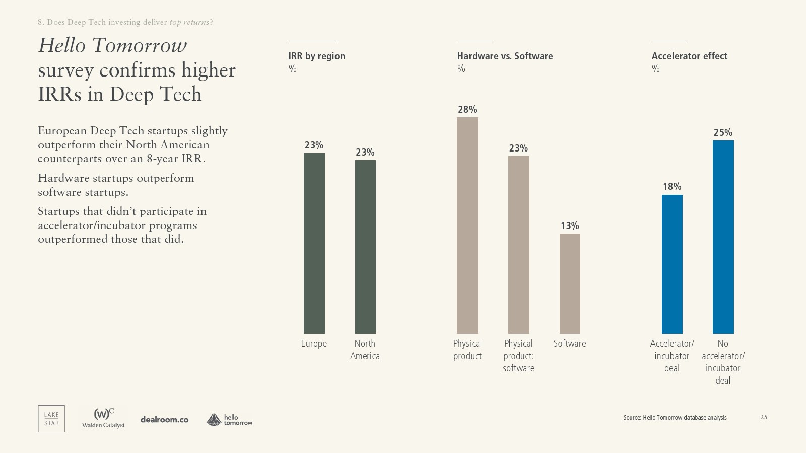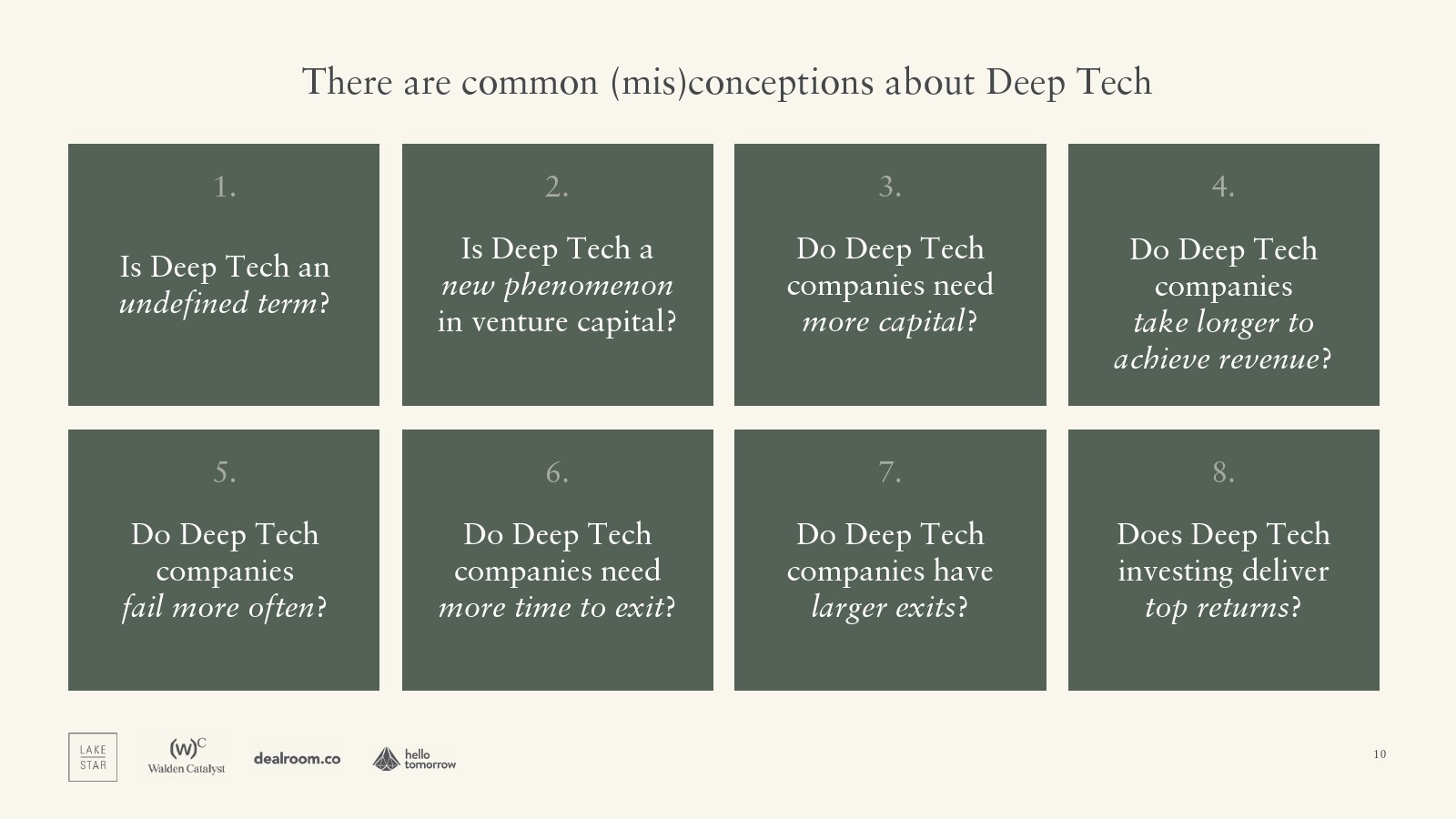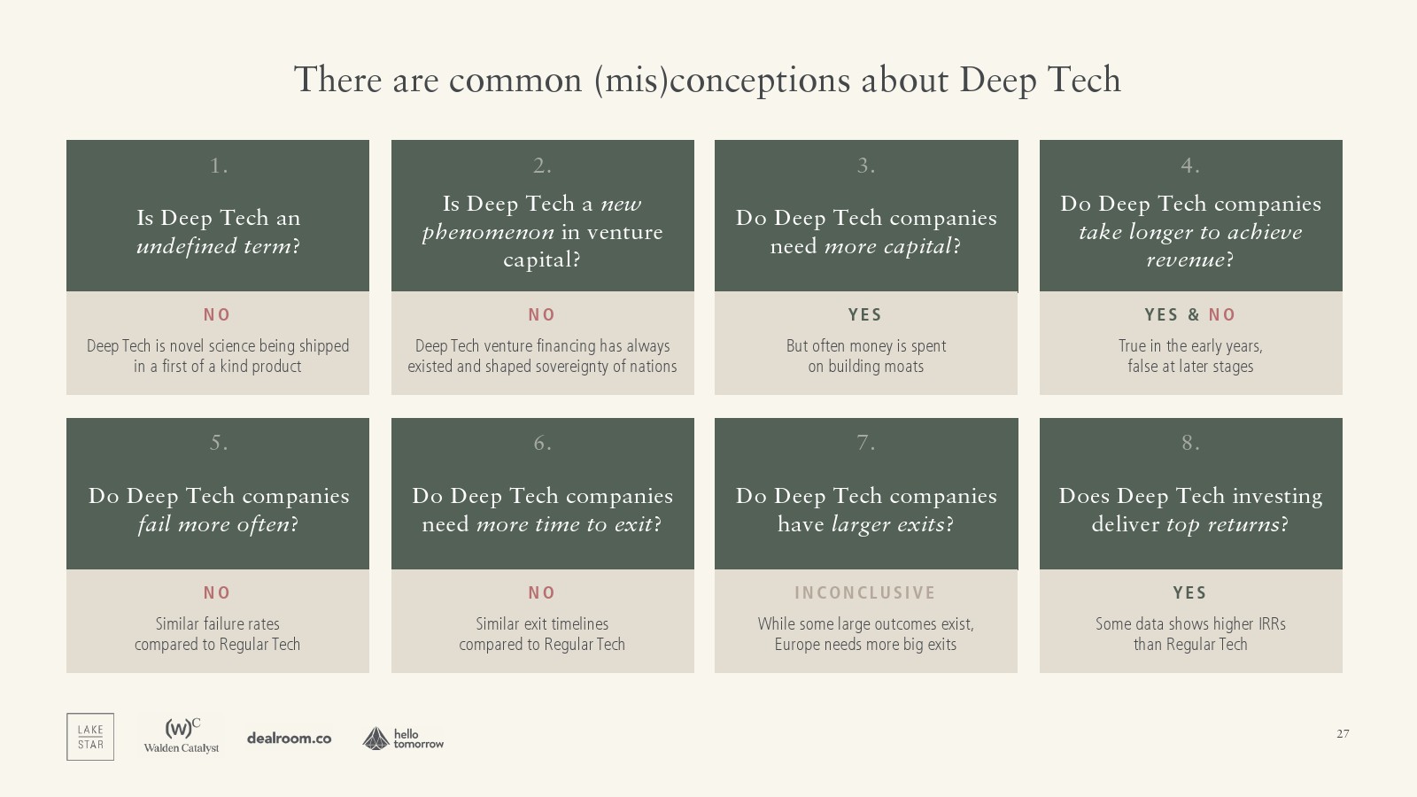 深度科技常常被误解。它专注于首次将科学和工程突破应用于产品。它是风险投资的起源,并通过催化变革性技术趋势在历史上塑造了区域主权。尽管通常需要更多资金,但大部分资金用于构建知识产权护城河,而不是广告。较长的开发时间延迟了初始收入,但一旦技术成熟,收入增长往往会加速。退出市场仍不成熟,但总体回报表明,深度科技投资组合优于传统科技。