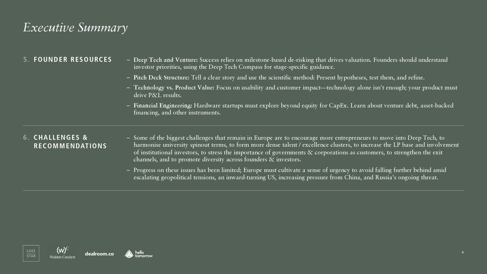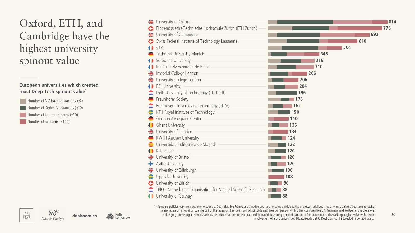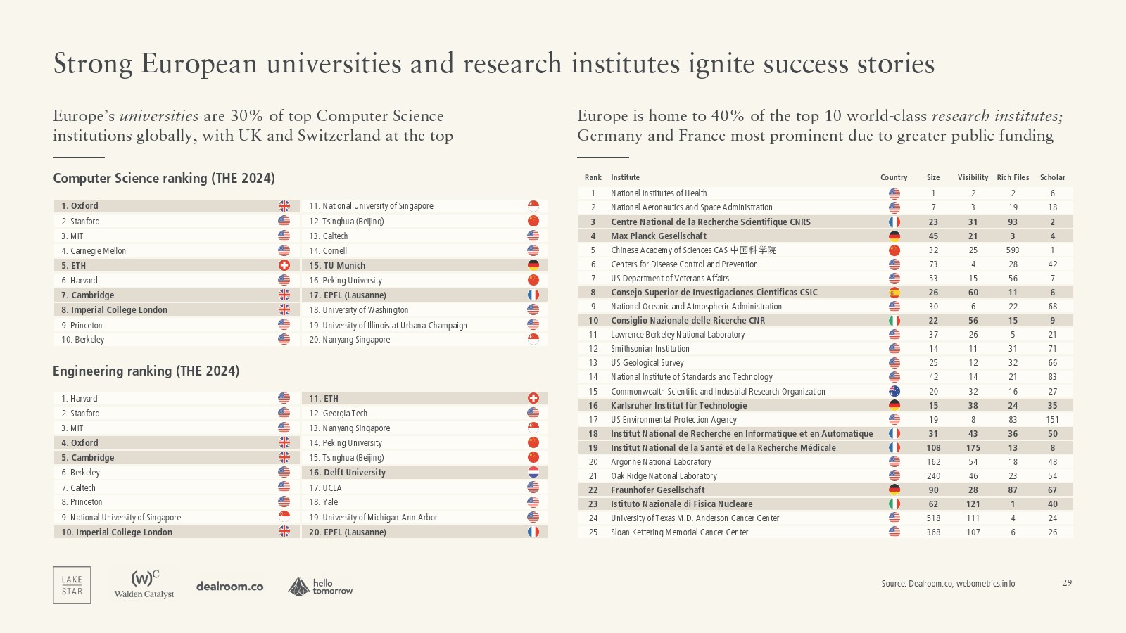 欧洲有潜力成为全球深度科技中心。它拥有顶级研究环境,全球前20所大学中有6所在欧洲,前25所研究机构中有9所位于欧洲。尽管其研究行业涵盖广泛的技术,但欧洲缺乏创业和冒险文化。欧洲应专注于牛津、剑桥、ETH、EPFL或TUM等卓越中心。此外,尽管美国受益于强大的创始人飞轮,如SpaceX、Palantir和OpenAI等公司,欧洲的创始人生态系统仍然主要局限于浅层科技。