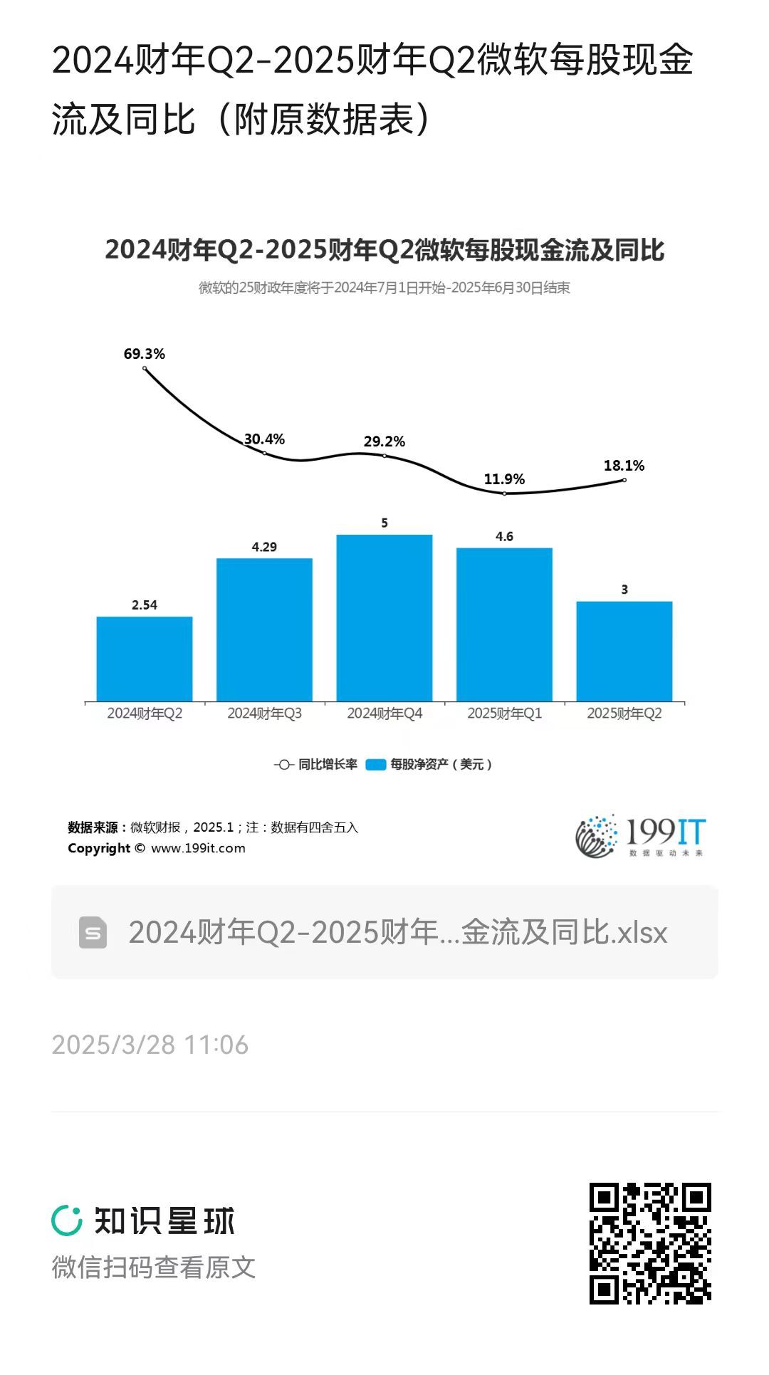- 2023财年Q2-2024财年Q2微软每股现金流及同比(附原数据表)