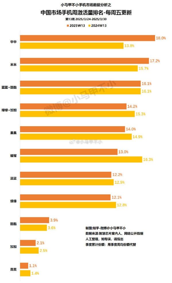 2025年第13周中国手机激活量份额排名及同比变化情况如下: