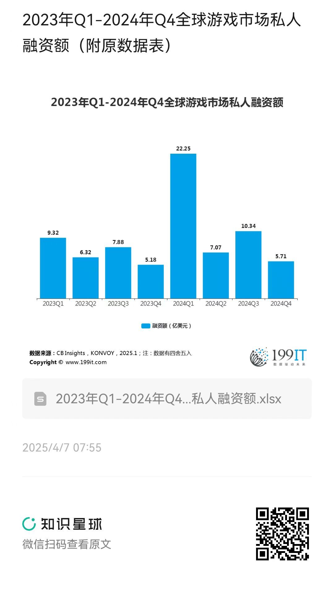 2023年Q1-2024年Q4全球游戏市场私人融资额(附原数据表) ​​​
