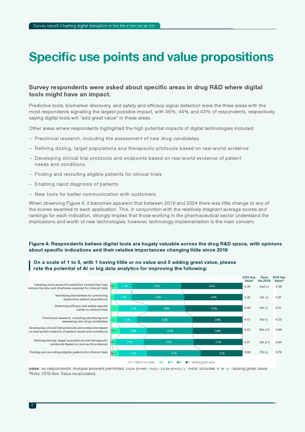调研显示,生命科学企业对数字技术的应用正持续扩大。2024年已有49%的企业在研发项目中实际使用AI和大数据,比2019年提高10个百分点;同时,35%的企业仍处于试点阶段,高于2019年的29%。然而真正实现系统化部署的企业比例仅从12%微增至13%,表明行业虽积极探索,但在组织层面全面整合数字技术仍面临复杂挑战。