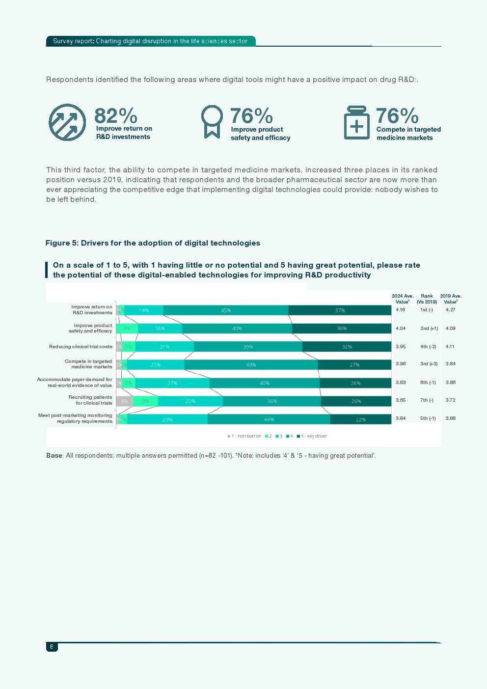 推动数字化转型的核心动力主要集中在研发回报率、产品安全性与精准医疗竞争力。82%的受访者认为数字技术可显著提升研发投资回报,76%认为能够提升产品安全与疗效,另有76%认为数字化是进入精准医疗市场的重要竞争手段。与此同时,企业预计未来1至2年数字技术投资平均增长34%,其中27%的企业计划增加超过41%的投入。
