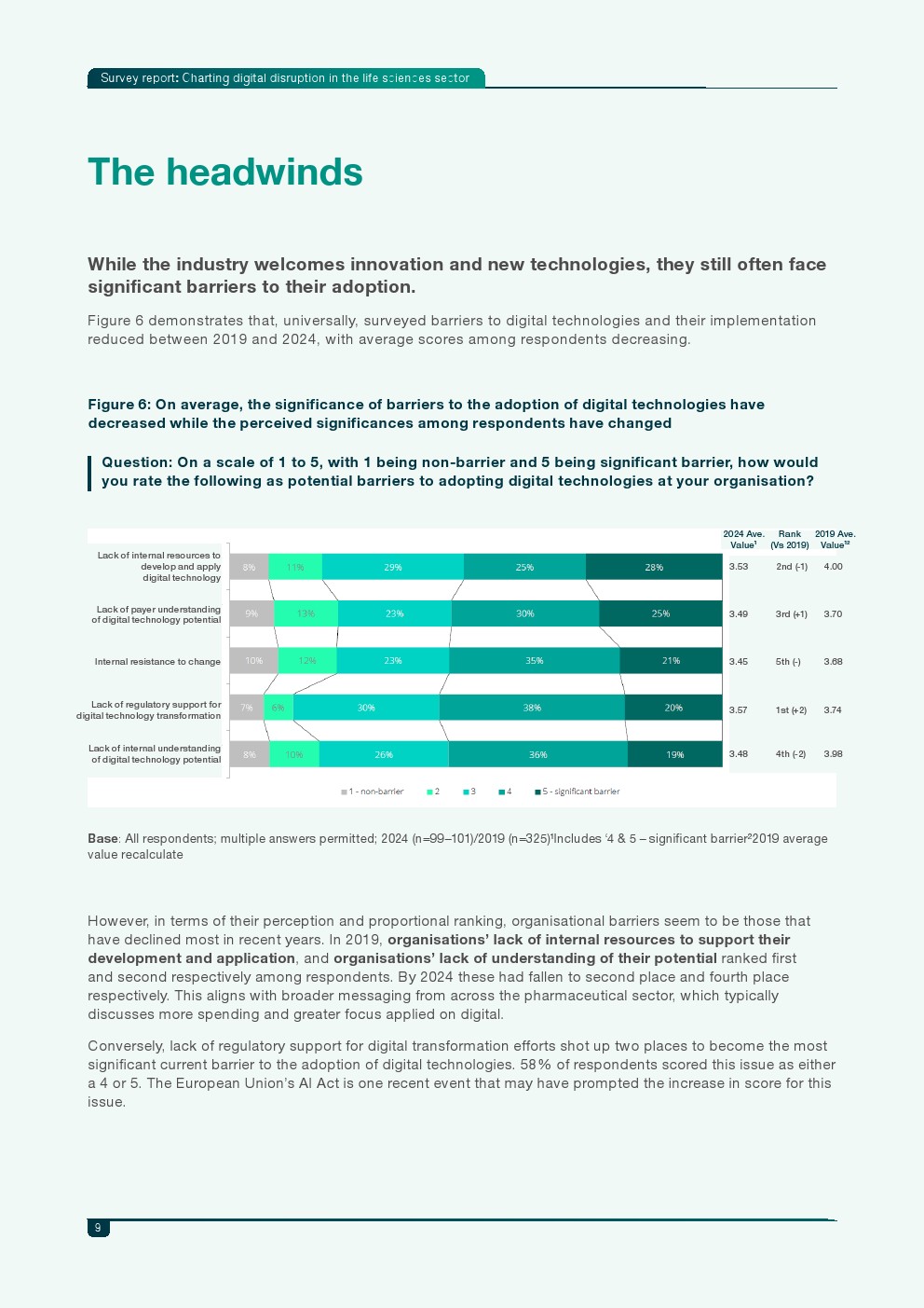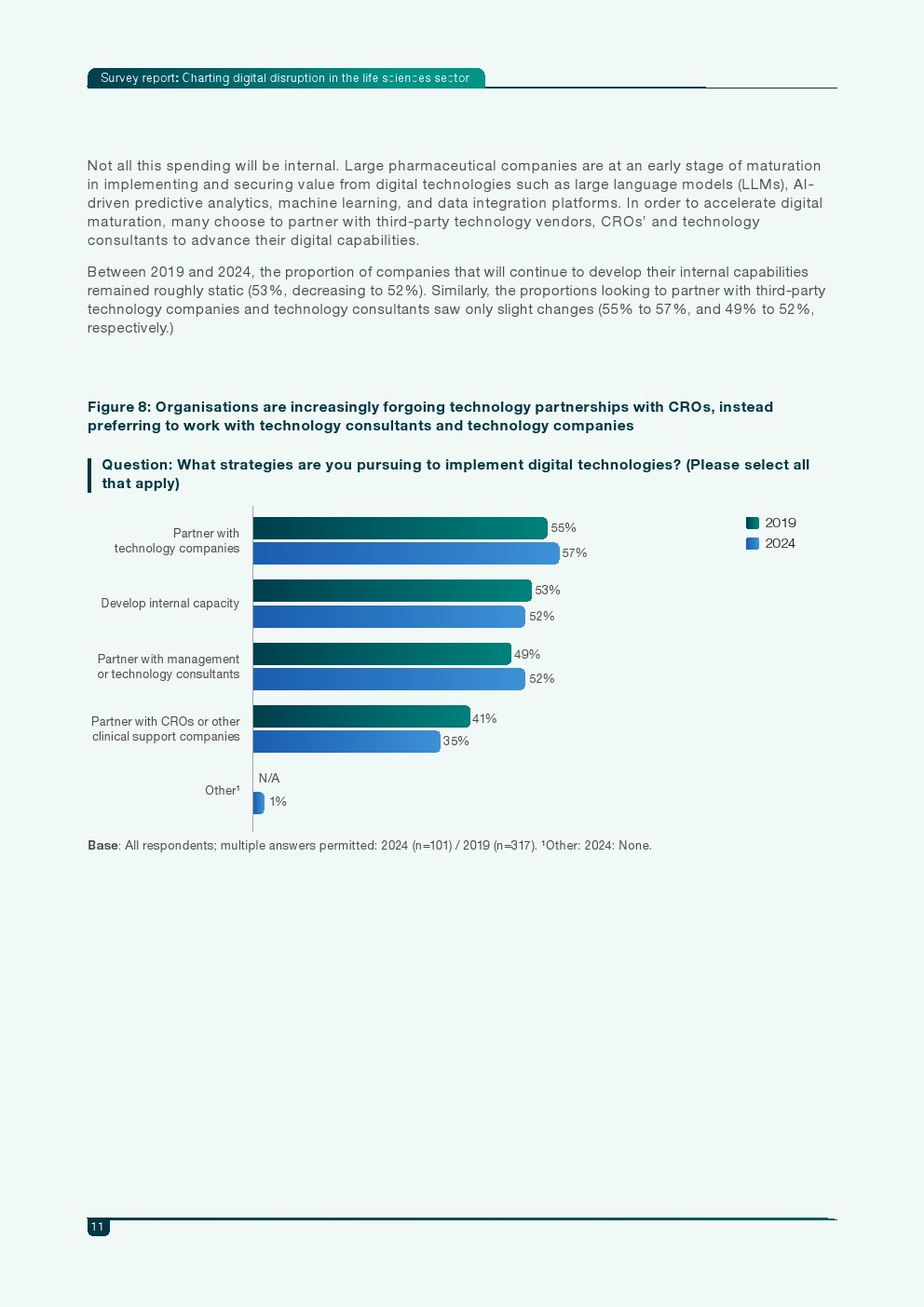 尽管行业信心增强,转型仍面临关键阻力。监管支持不足已成为当前最大障碍,58%的受访者将其视为主要问题。相比之下,内部资源不足与组织认知不足的障碍程度已明显下降。此外,企业在实施路径上呈现出“内部能力建设与外部合作并行”的策略,超过一半企业选择同时与技术公司或咨询机构合作推进数字化能力。
